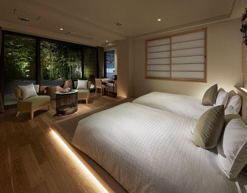 全室にシモンズ社製マットレスを備え、快適な眠りを提供しています。機能性と上質さを兼ね備えた南館「かぐや」と、伝統的な美しさとモダンな雰囲気が調和した北館「みやび」の2つのコンセプトルームがあります。客室は、旅のスタイルに合わせて選ぶことができ、畳敷きの和洋室や露天風呂付きのラグジュアリールームなどがあります。