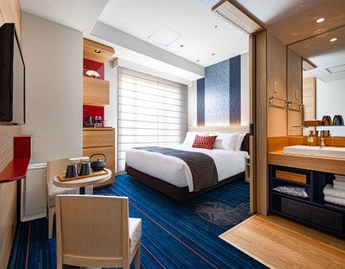 客室は京都の魅力があふれるデザインで、全室にシモンズ製ポケットコイルベッドを採用し、洗い場付きバスルームや独立洗面台も完備しています。シングルやダブル、プレミアムツインなど多彩な客室タイプを用意しており、バリアフリーに対応した客室もあります。