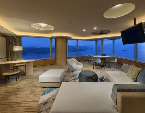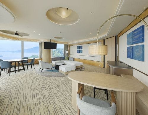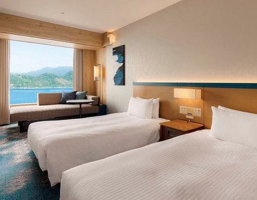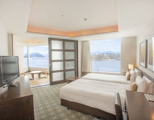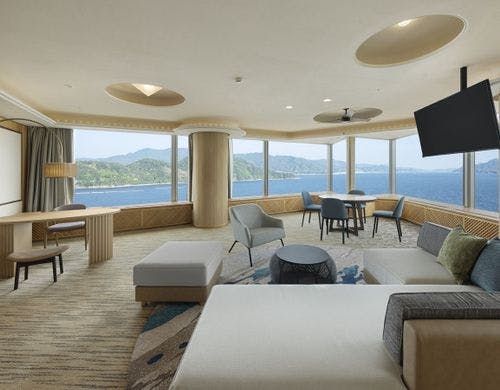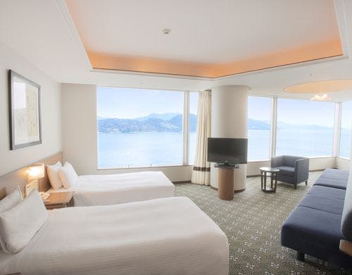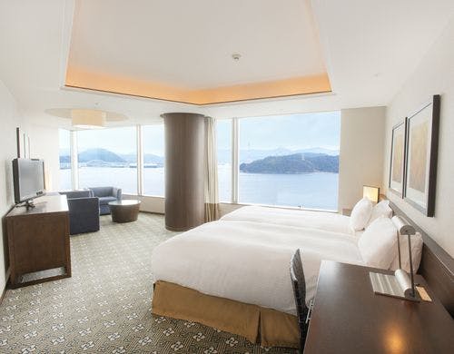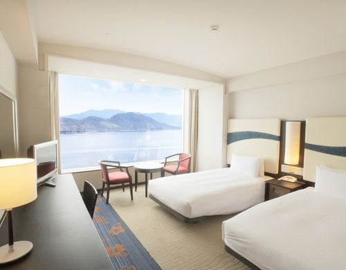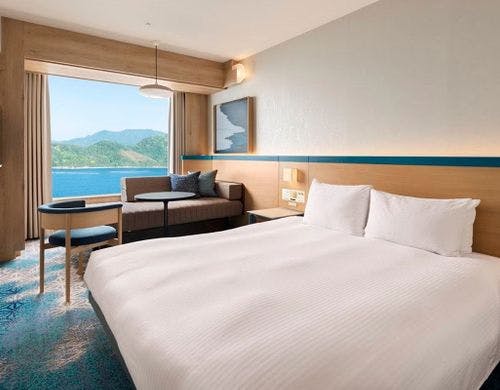 広島駅より無料シャトルバス運行中。ホテル前桟橋~宮島まで高速船で26分と便利