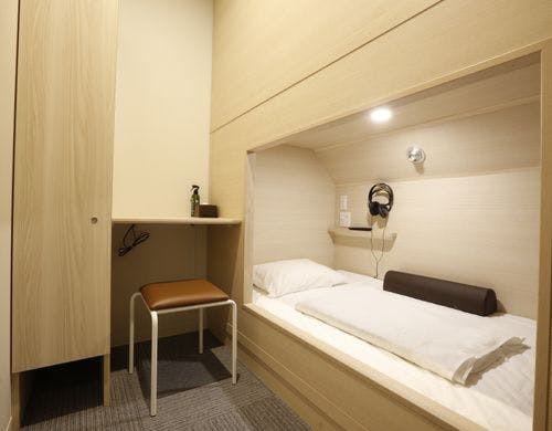 博多駅から西鉄バスもしくは地下鉄七隈線で1本、西鉄薬院駅から徒歩1分、全室個室型のカプセルホテル!