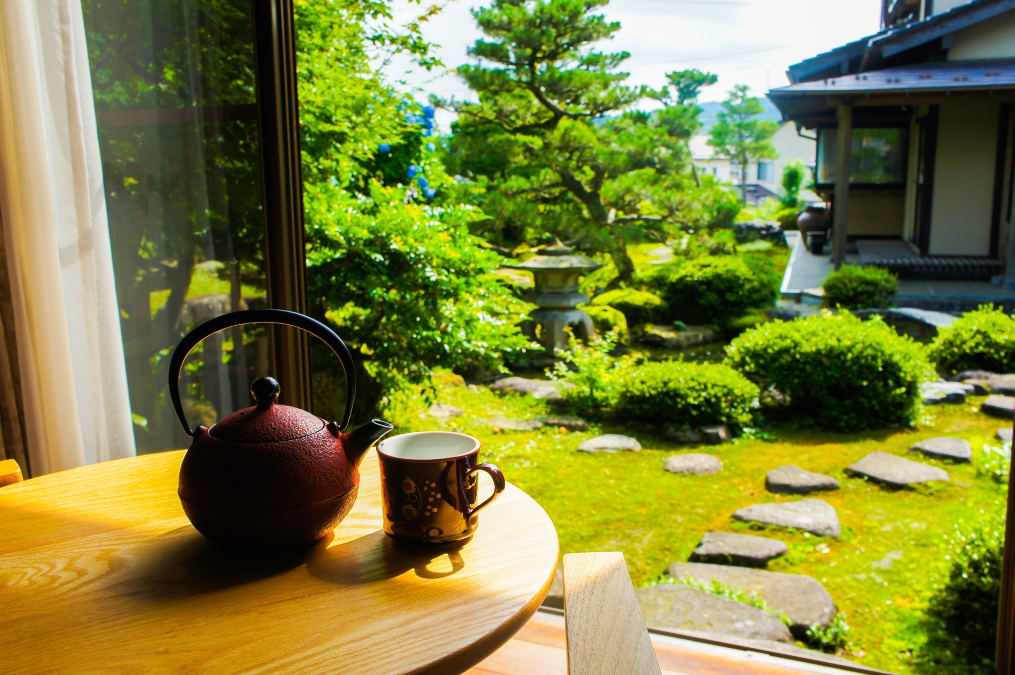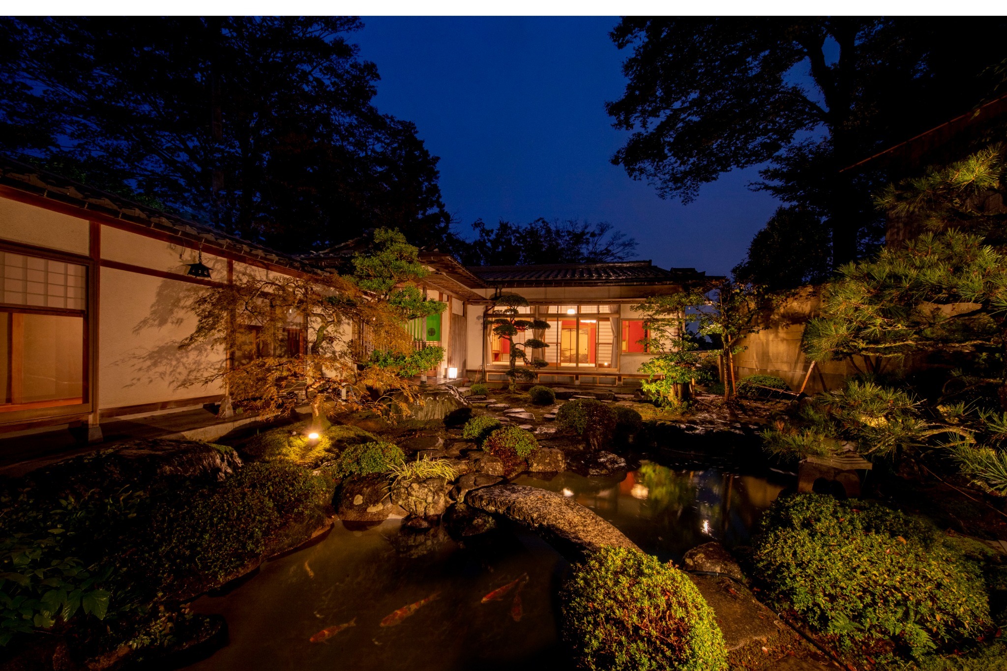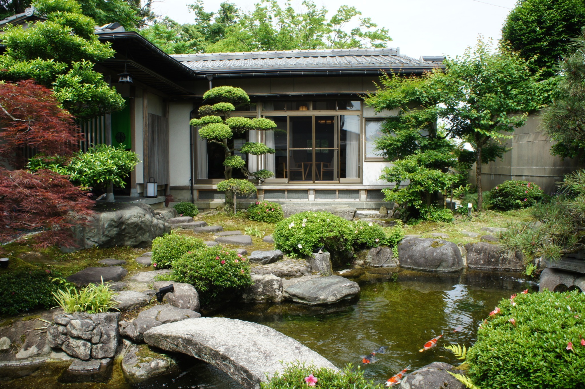 鯉が泳ぐ美しい日本庭園を眺めなら侘び寂びの世界観を