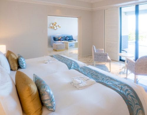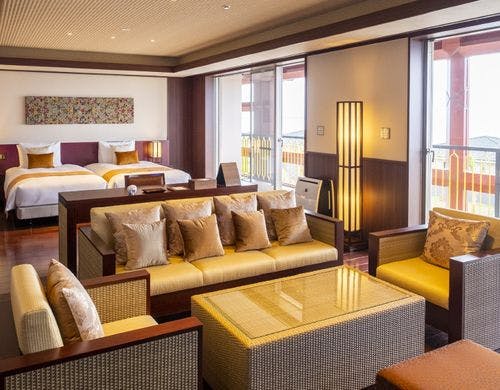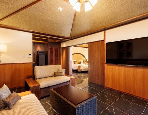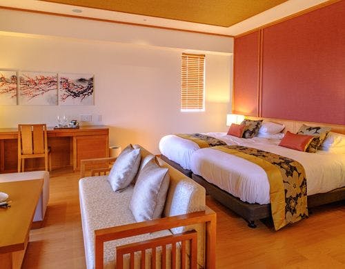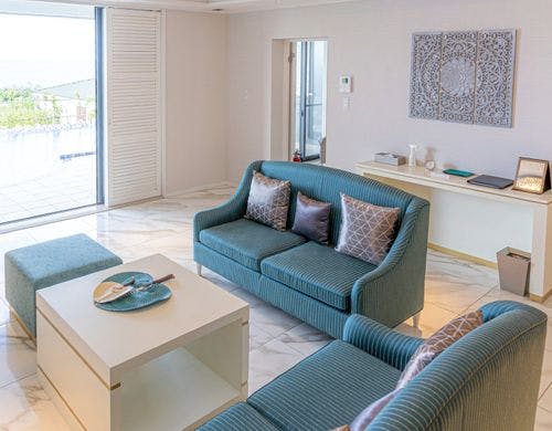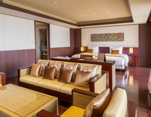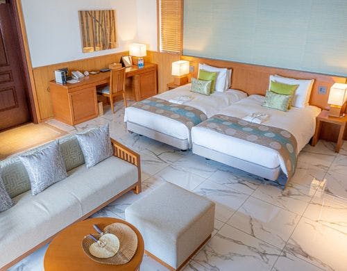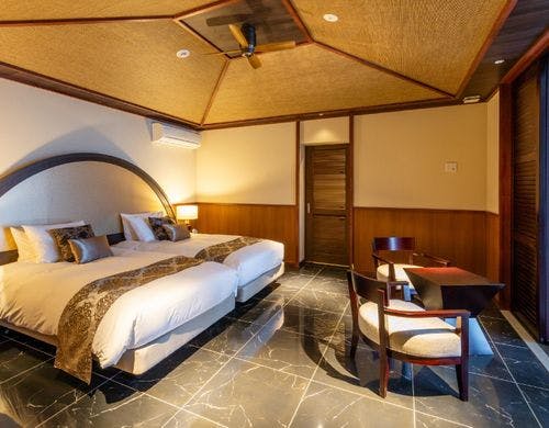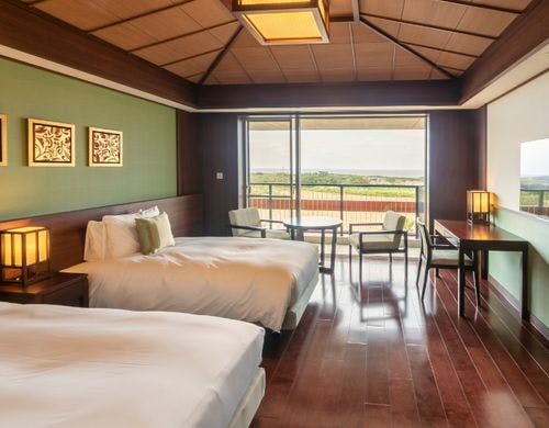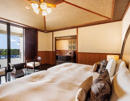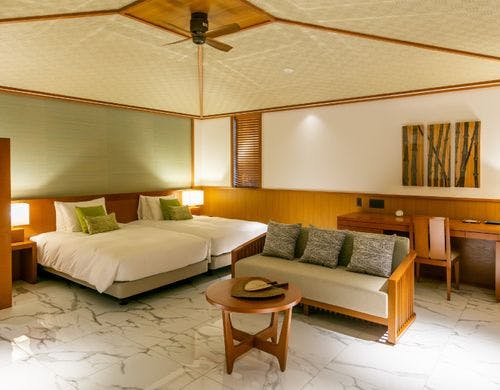 全169室の客室は、独立型の「ビラハウス」とホテル棟の「首里ハウス」の2タイプに分かれています。「ビラハウス」にはプライベートプールまたはジャグジーが付属し、全室スイートルームで広々とした造りです。「首里ハウス」は沖縄の伝統を感じる設計で、全室にゆとりあるバスルームを備えています。
