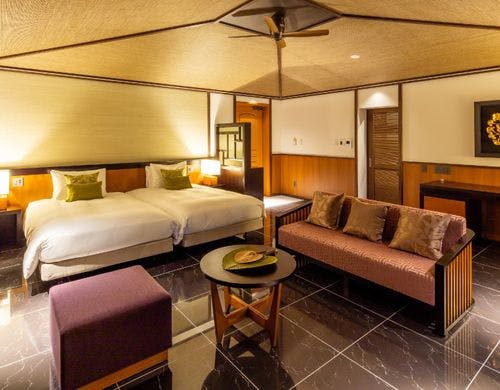 プール付ビラとホテル棟の客室で南国を満喫。小学生まで添い寝可能♪空港~ホテル間の無料送迎サービス中!