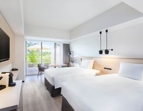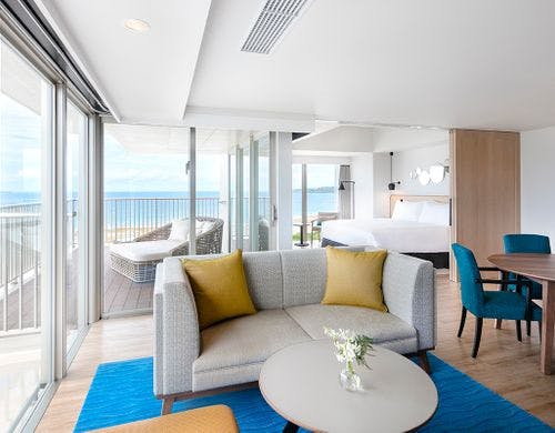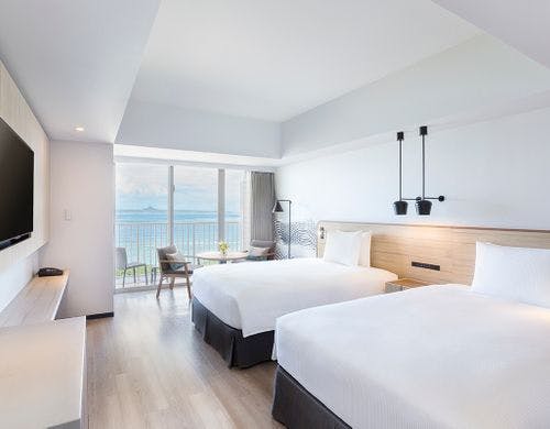 オーシャンビューの客室がそろい、バルコニーから美しい景色を望めます。キングベッドやツインベッドの部屋に加え、バリアフリー対応のアクセシブルルームも完備。最上階にはエグゼクティブルームがあり、専用ラウンジの利用も可能です。モダンなデザインと機能的な設備が、快適な宿泊を提供します。