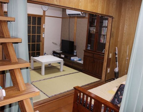 2階に和室と洋室、1階にはキッチンスペースと和室、浴室です。駐車場1台無料です。狭いのでアルファードクラスは不可です。運転手以外は路上で降りてください。