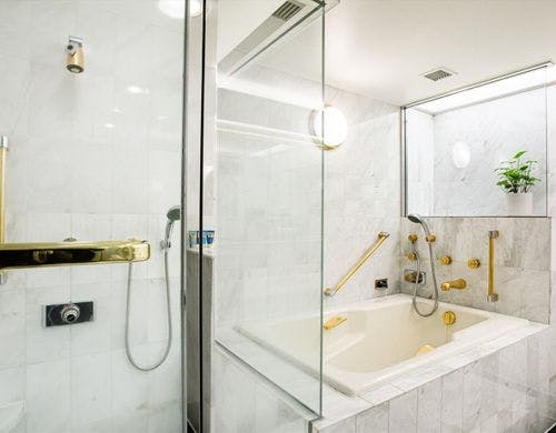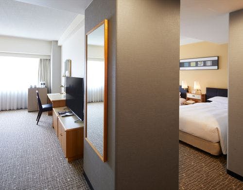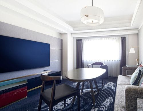 客室は全室26.5平米以上で、明るい照明と色合いの中にシンプルなデザインの家具を配した開放感のある空間です。シングルからスイートまで多彩なタイプが揃っており、広々とした和室や和洋室など、用途に応じた選択が可能です。パウダーコーナーや大理石のエントランスがある客室も用意されています。