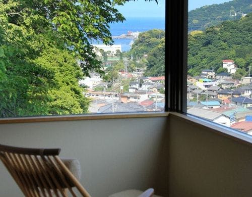 網代湾を望む高台に建つ自家源泉の宿。