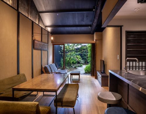 京町家一棟貸切の宿。織屋建て特有の吹き抜け空間に歴史漂う大きな梁。思わずおこもりしたくなる滞在を。