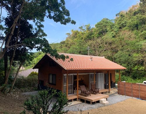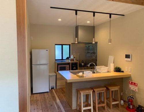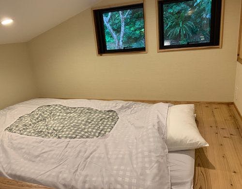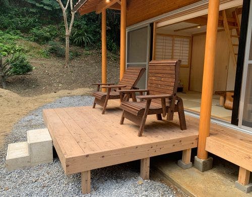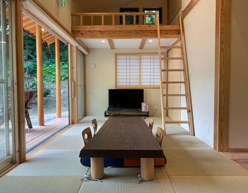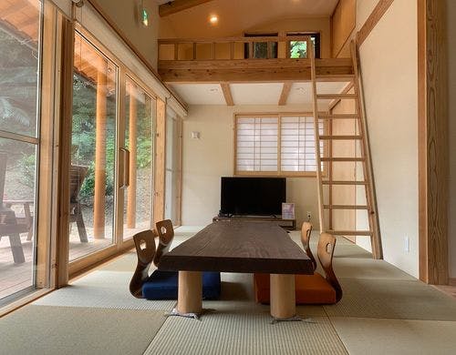 森の中に建つ一軒家です。(定員6名まで)静かな場所で鳥や虫の鳴き声を聞きながらゆっくりできます。リビングから突き出たデッキでくつろいだり、広い庭でバーベキューを楽しんだりできます。