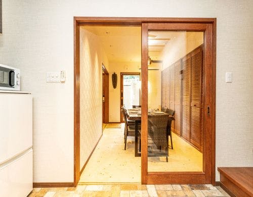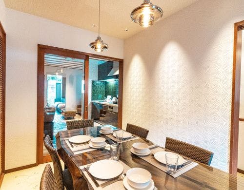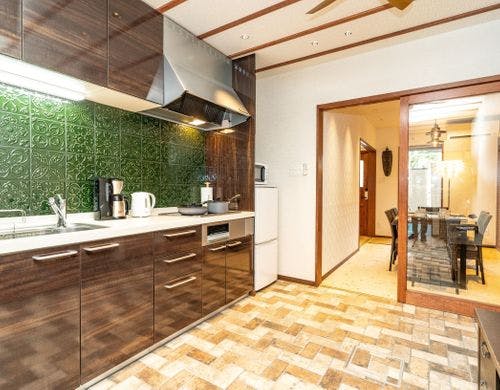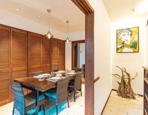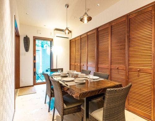 バリ島をイメージした隠れ家的な雰囲気が魅力の広々4LDK二階建て一軒家。一泊から長期滞在、ワーケーションにも。無料駐車場、癒しの坪庭あり。