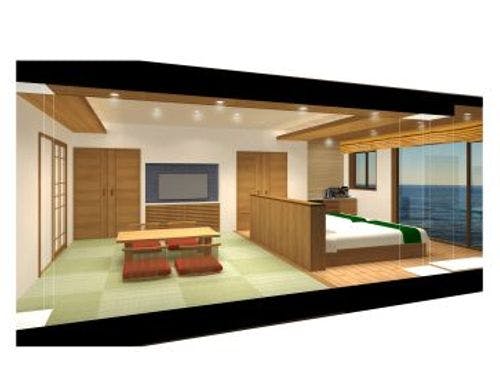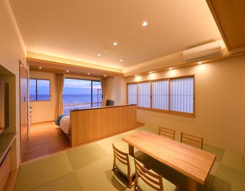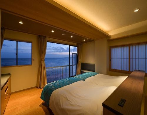 【 2022年リニューアルオープン!エグゼクティブツインルーム 那海 / 陽海 / 碧音 】さえぎるもののない180度の海景色と、水平線に浮かぶ伊豆七島の島影。客室露天風呂や大浴場からは、どこまでも広がる空と海の美しさが奏でる名画を愉しめる。お食事は伊勢海老や金目鯛などが並ぶ豪華な海鮮料理、良質の漁港を持つ稲取ならでは食材の饗宴を愉しんで…
