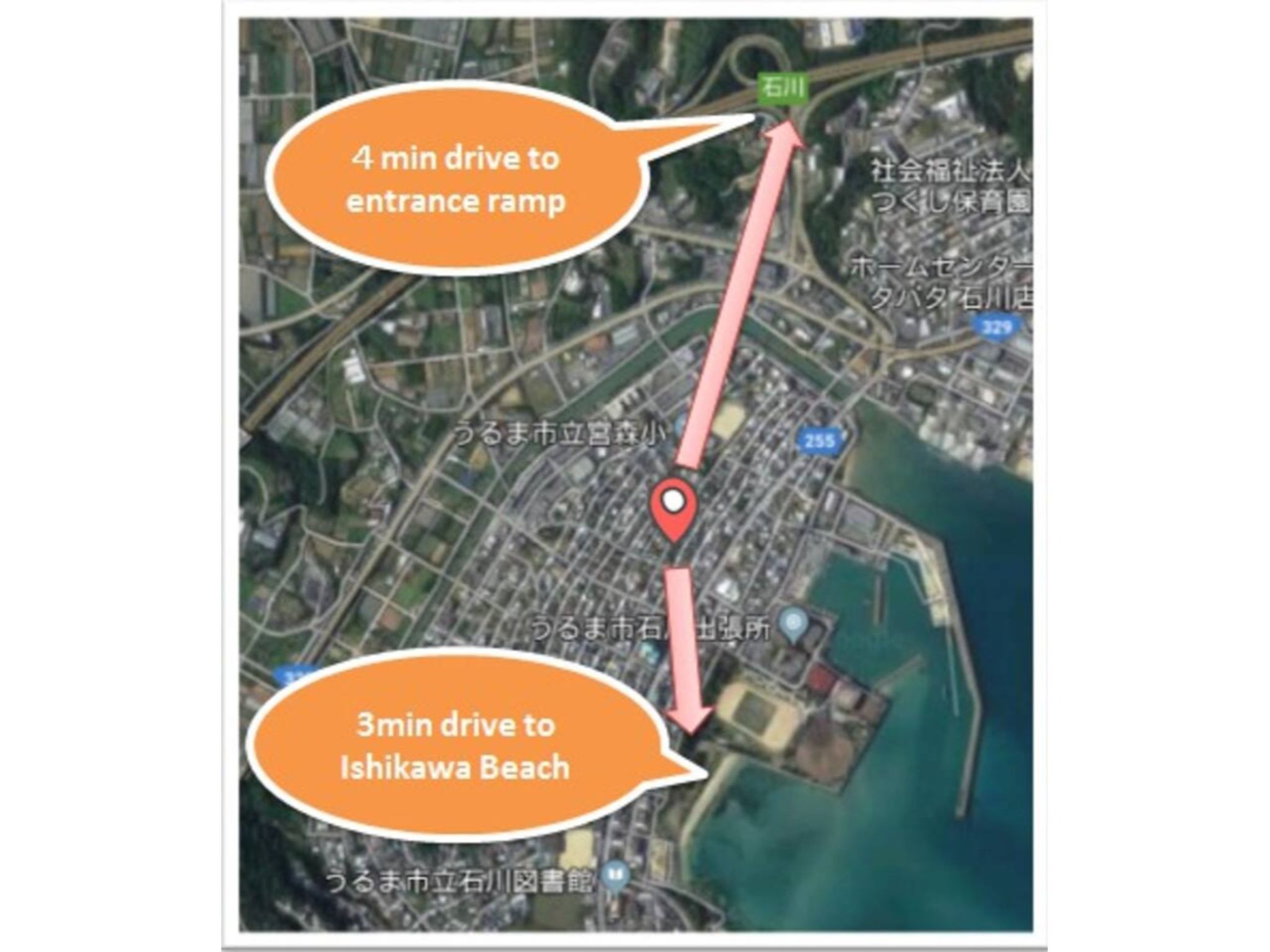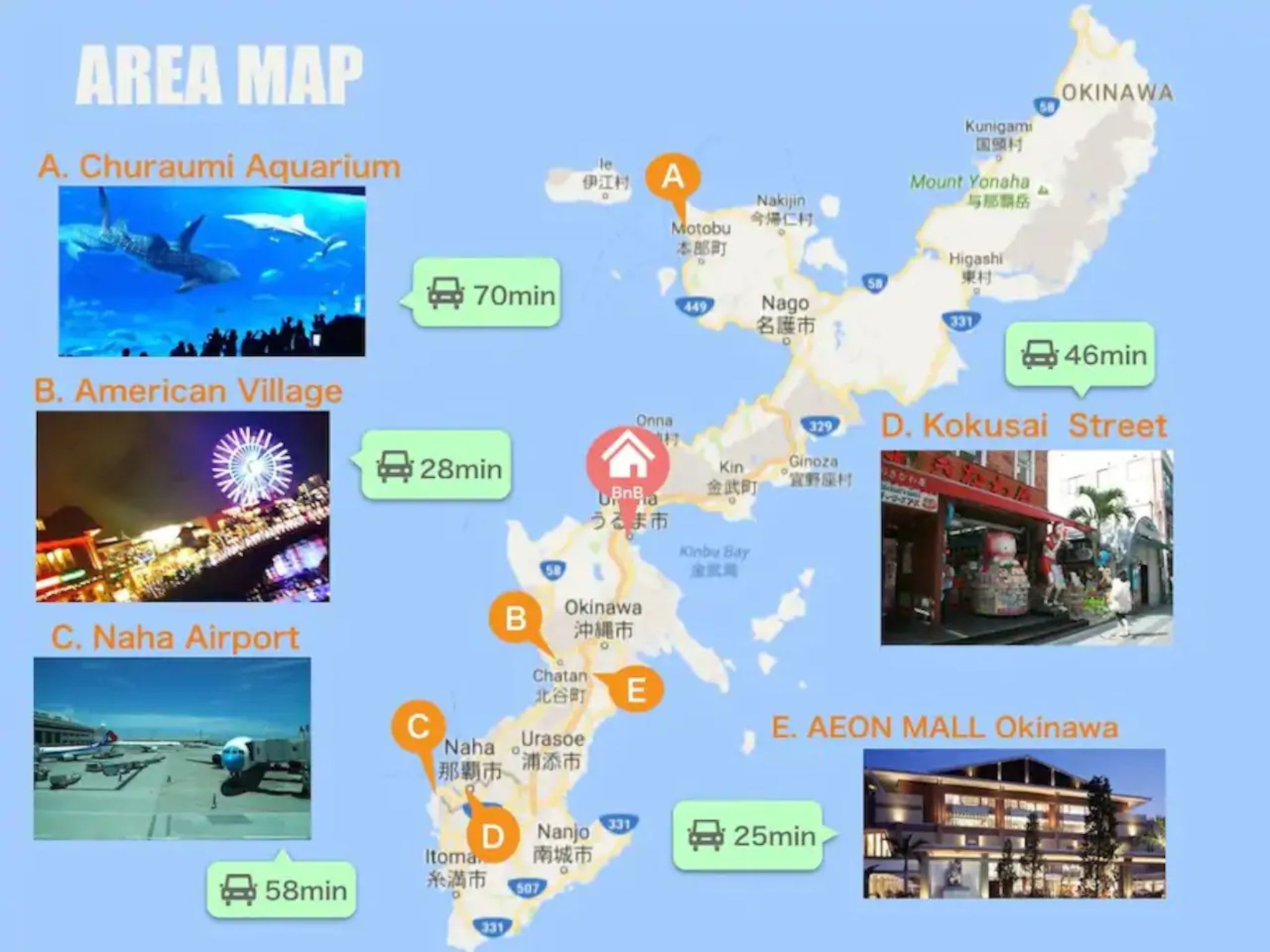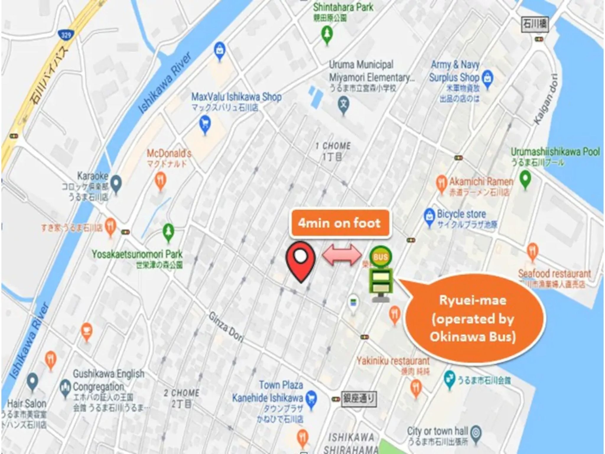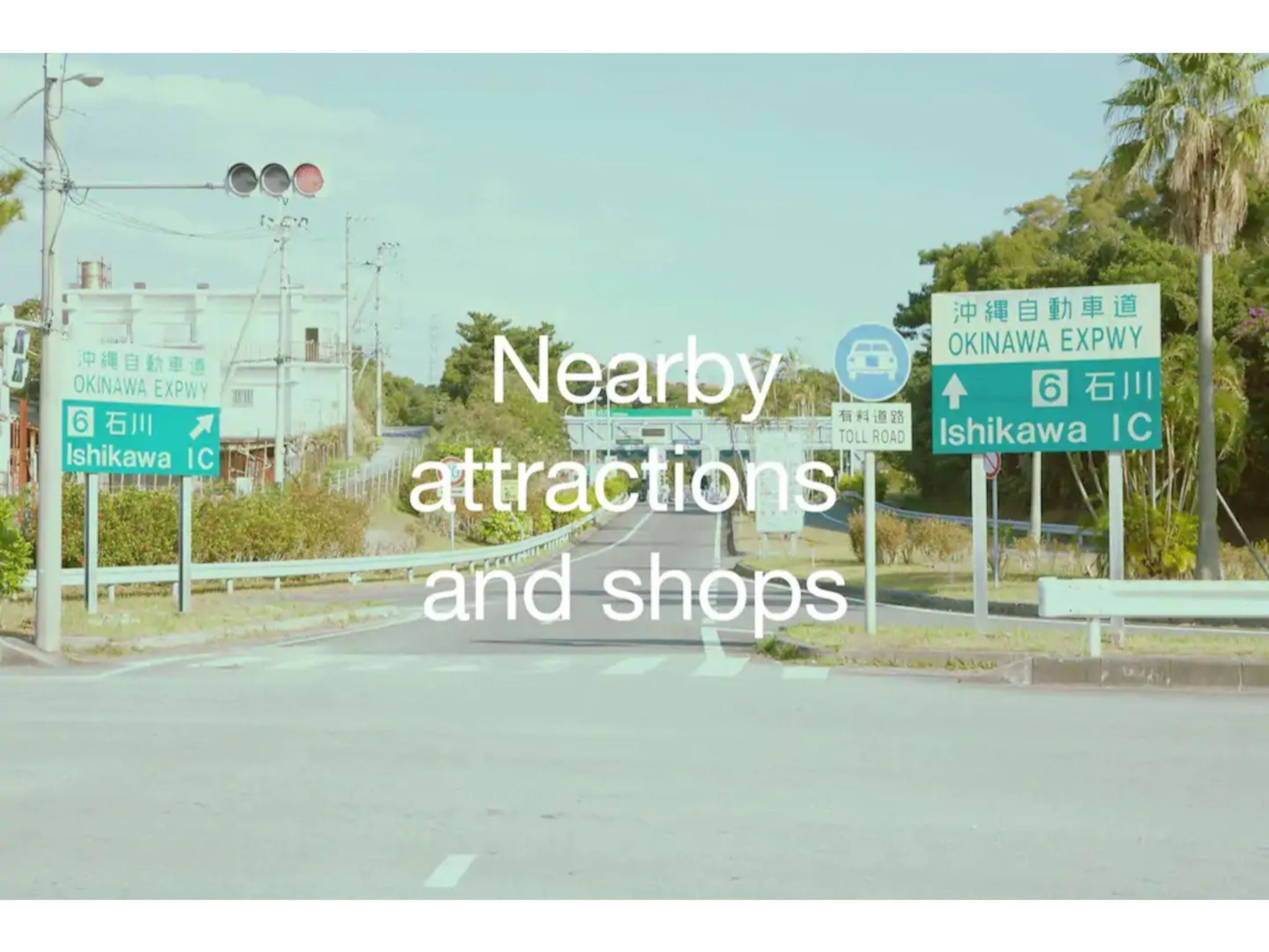 石川ICからは車で4分、石川ビーチまで車で3分の好立地にあり、空港や主要な観光地がある那覇までは車で40分ほどで到着します。
