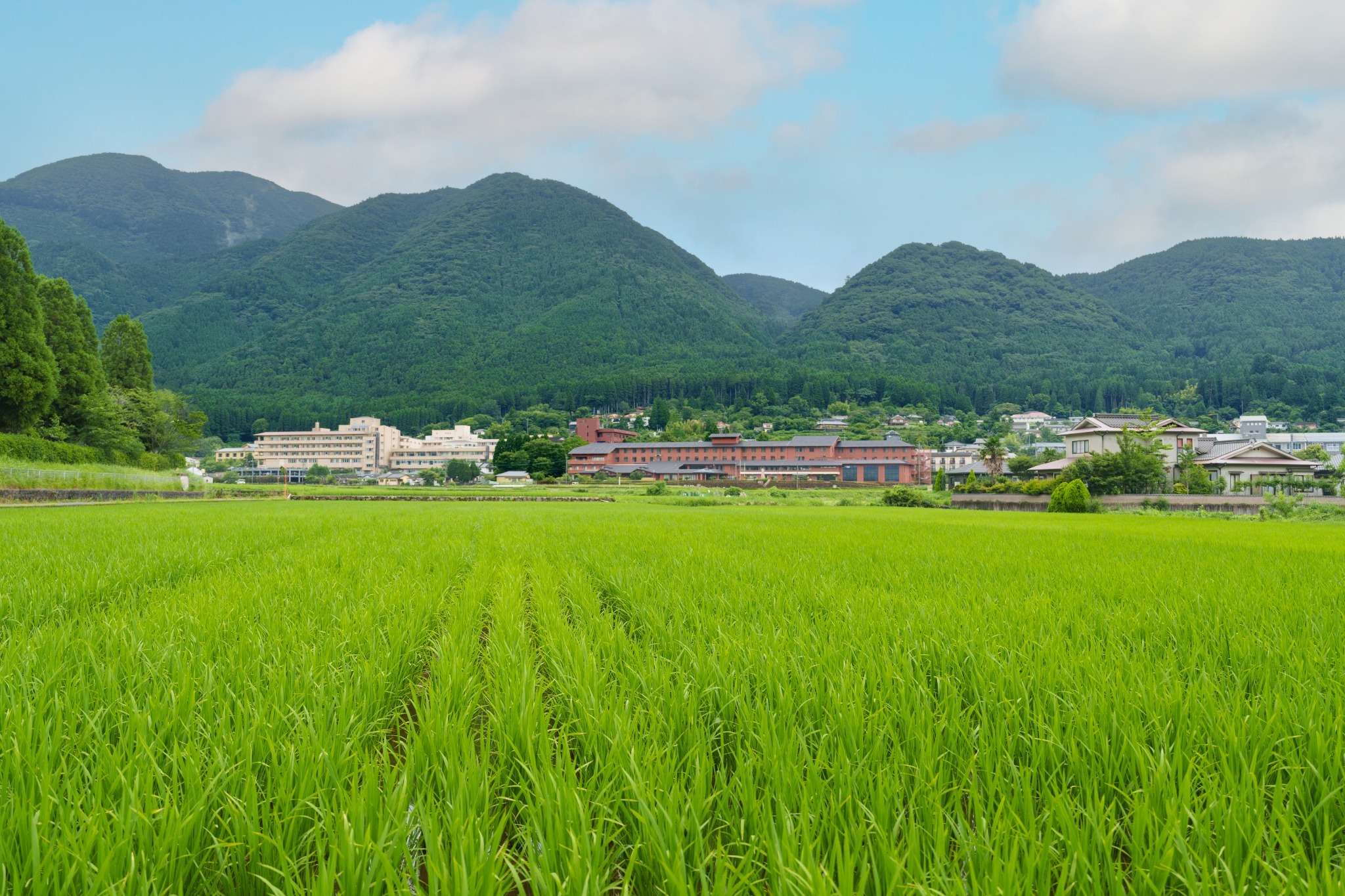 由布院駅から徒歩7分にあるせせらぎ庵。宿へ向かう旅路には美しい田園風景が広がり、散歩でも小トリップを楽しめます。