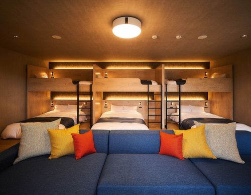 約73平米の101-103、105-107のお部屋は、上段シングル・下段ダブルの2段ベッドを3台、
