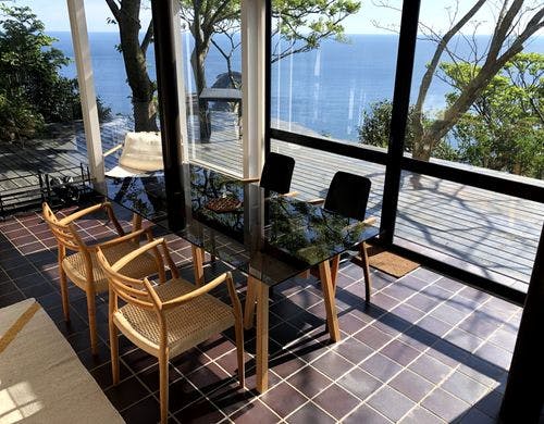 ガラス張りのコンクリート造という無機質なデザインなのに、伊豆特有の自然と海の絶景に囲まれ、太平洋に面した崖の上で、目の前に太陽が沈むという物語性のある立地。