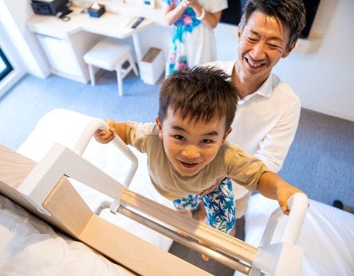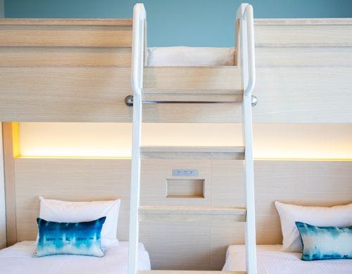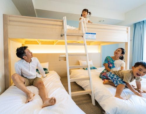 客室は1名から利用できるシングルユースから6名まで利用できるデラックスファミリールームが備わっており、22.1平方メートルから44.6平方メートルまでの広さが特徴。バルコニー付きの部屋や、ロフト付きのファミリールームなど、多様なタイプがあります。全室に広めのベッドを備えており、快適な睡眠環境が整っています。