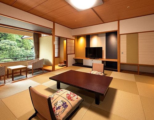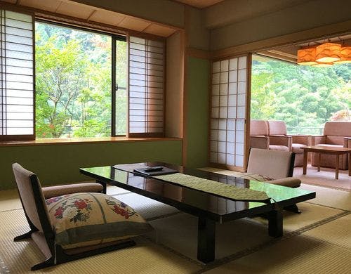 杖立温泉街中央の渓流沿いに建ち、和の情緒たっぷりな数奇屋づくりの宿。ひぜんやから徒歩3分の和風別館