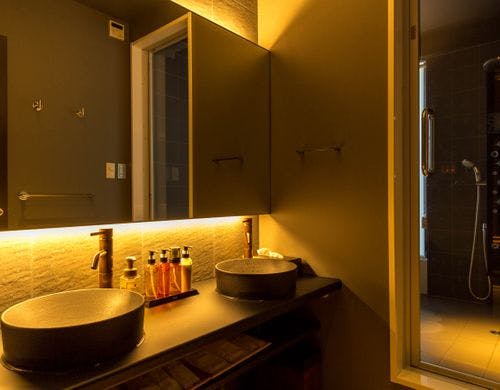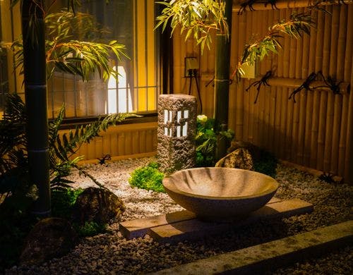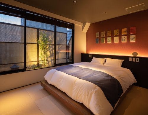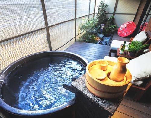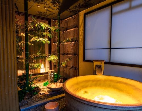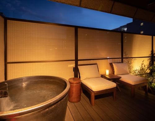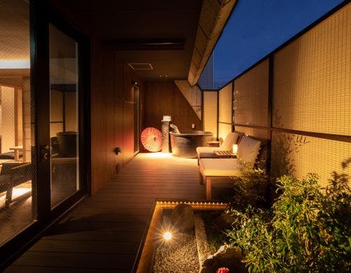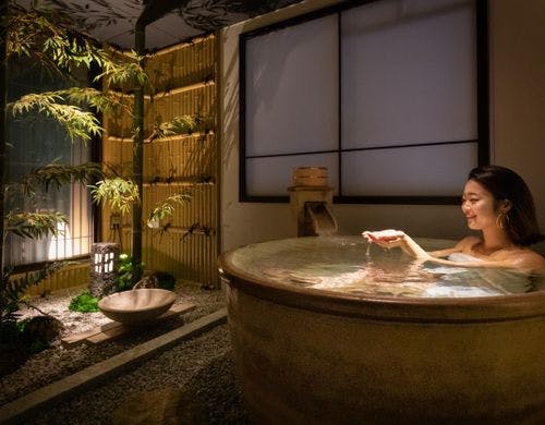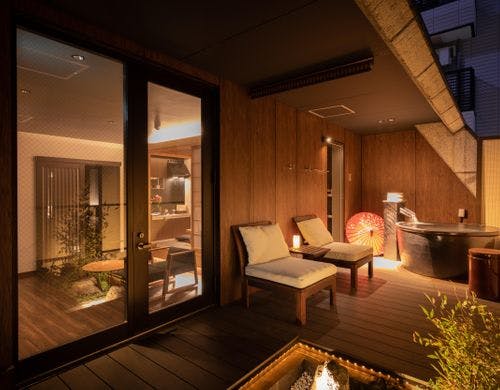 「道頓堀の宿 今昔荘 庭風呂別邸」は都市型高級民泊施設として作られました。信楽焼の風呂、庭、アメニティや美容家電から日本の「昔」と「今」を体感できる宿です。