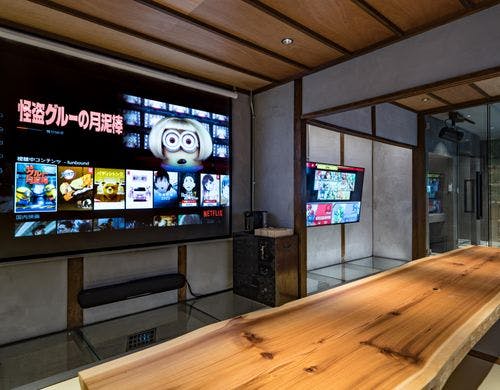 屋内にある檜風呂にはプロジェクションマッピングが備わっており、水面に映る泳ぐ魚や花火を楽しむことができます。