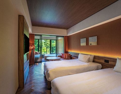 客室はスーペリアルームやデラックスルーム、メゾネットタイプのスイートなど多彩にあり、家族や友人との旅行など、人数やニーズに応じた利用が可能です。全室にスマートテレビや空気清浄機を完備し、快適な滞在をサポートします。やんばるの森を望むジェットバス付きの客室もあり、特別な時間を演出しています。