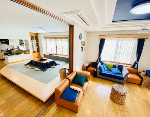 一棟貸切!プロジェクターがあるリビングやお茶室もある、和モダンなデザイナーが手がけた平屋一棟貸別荘。【15人定員】
