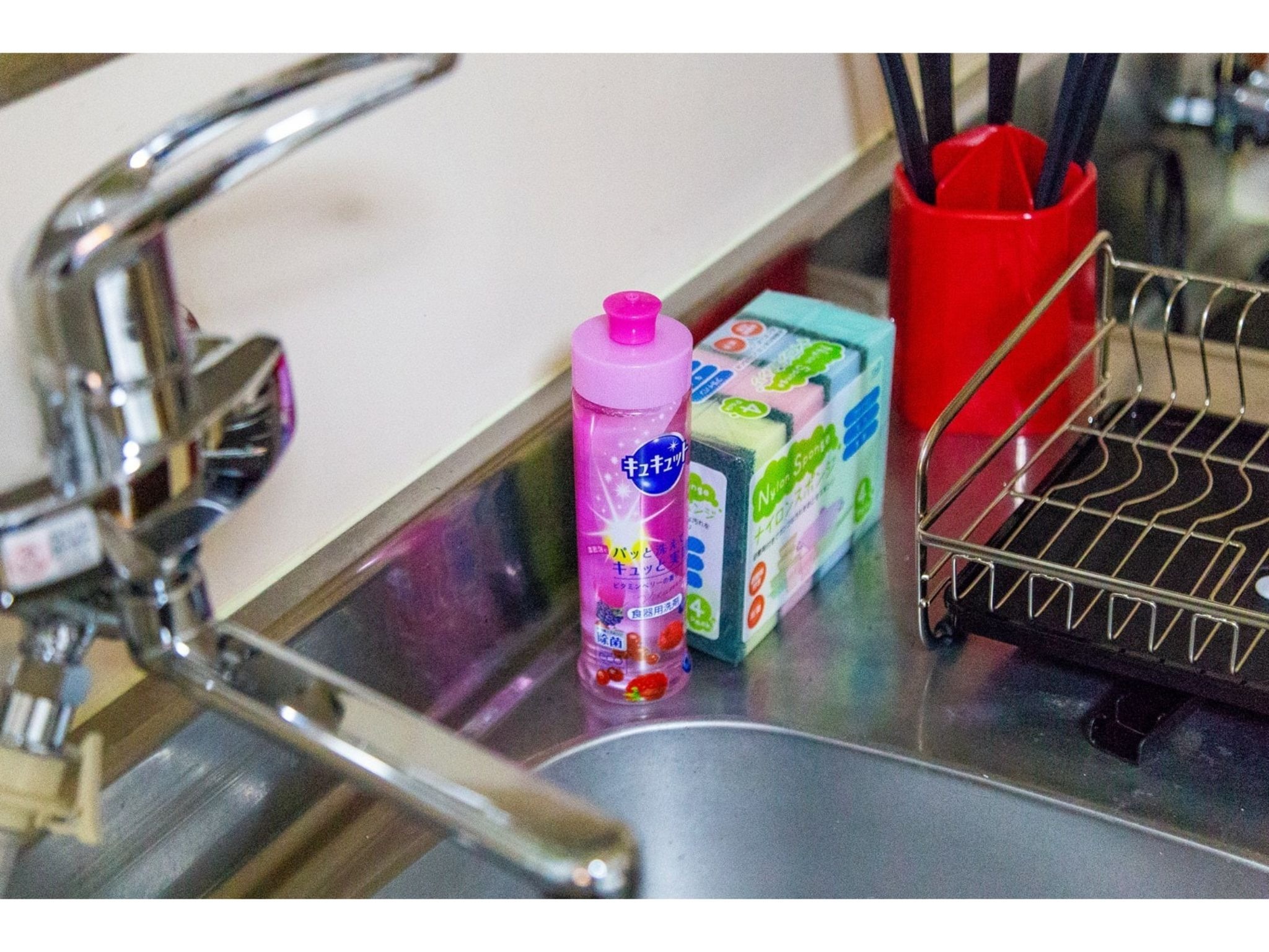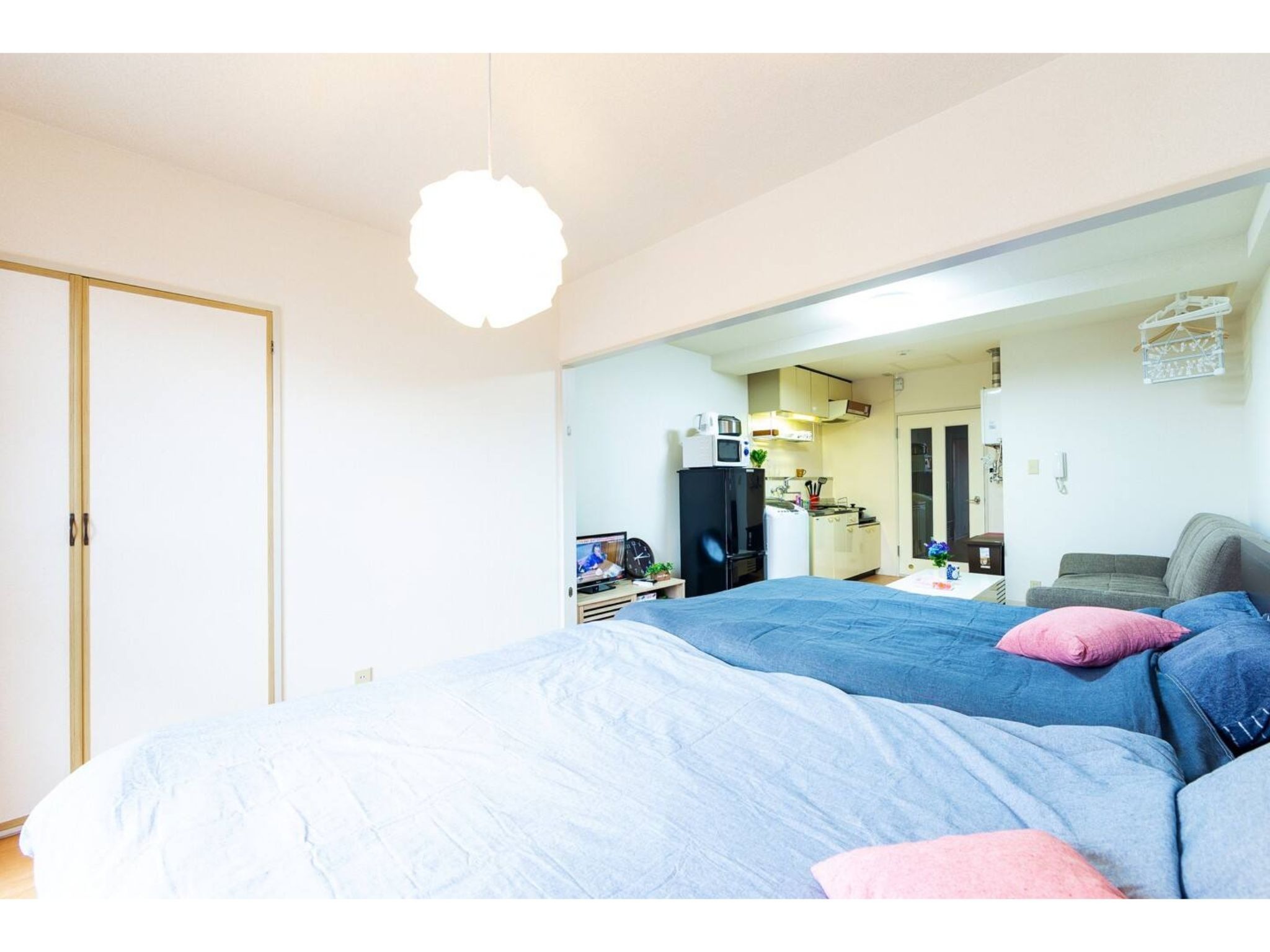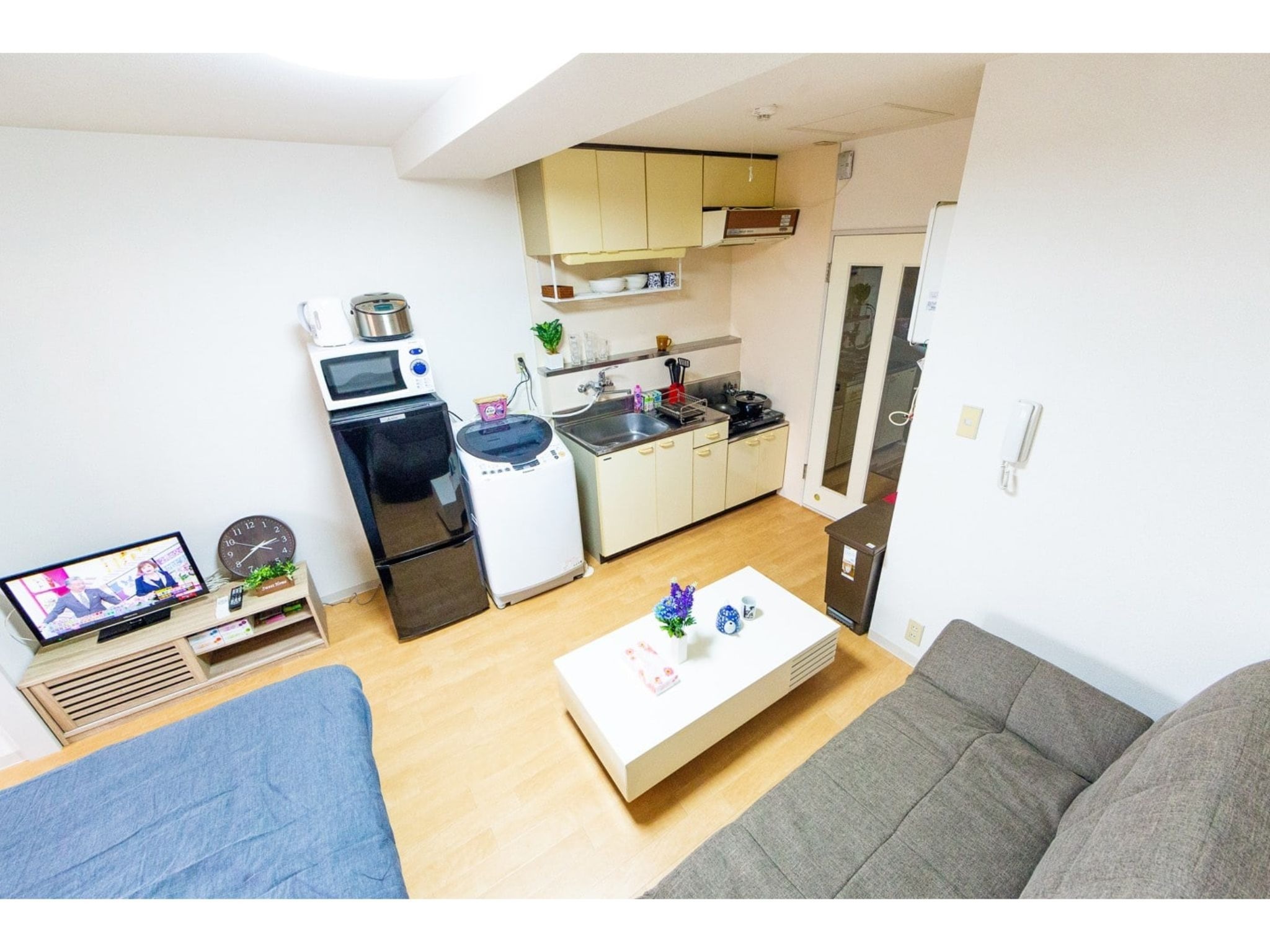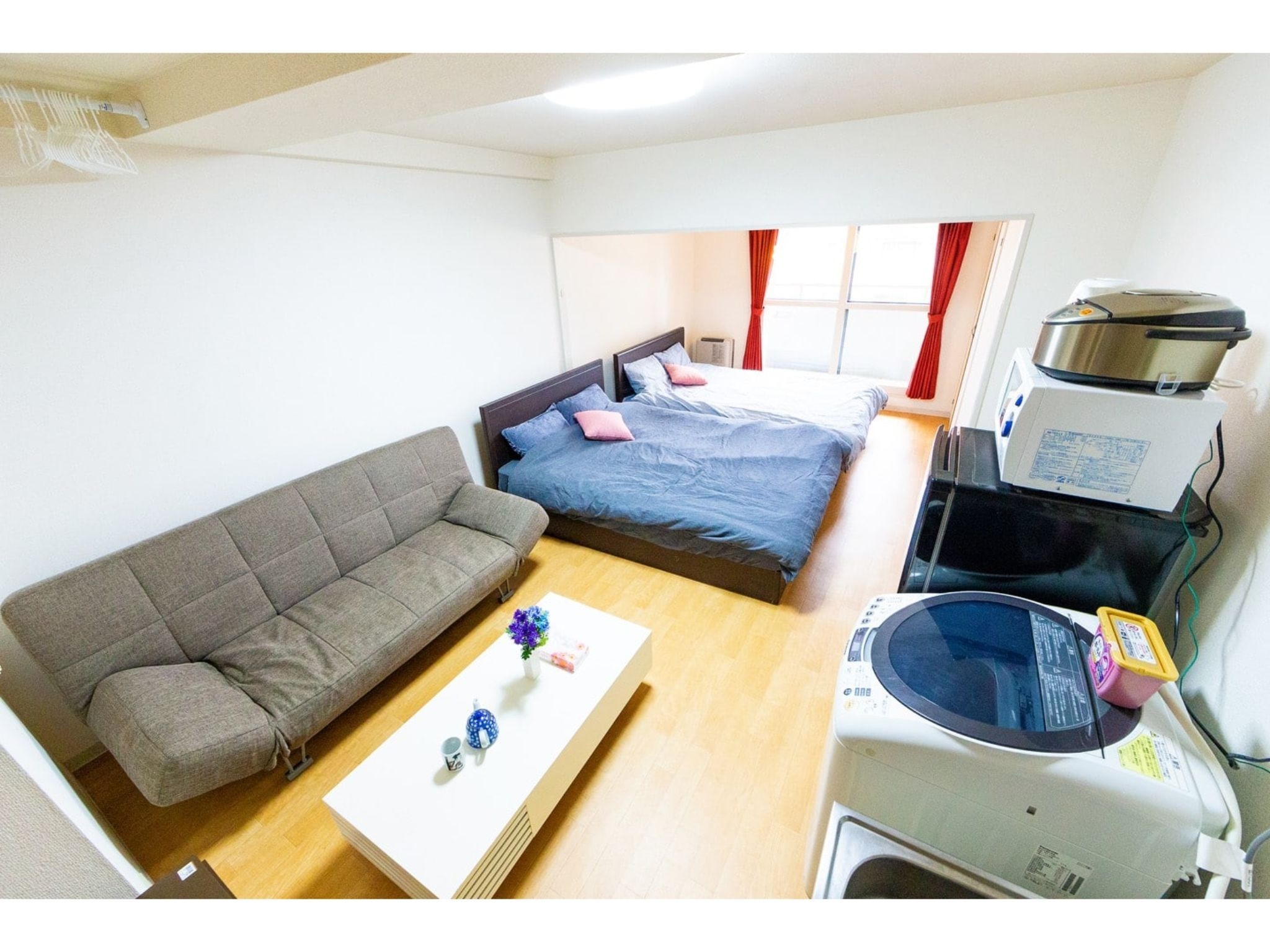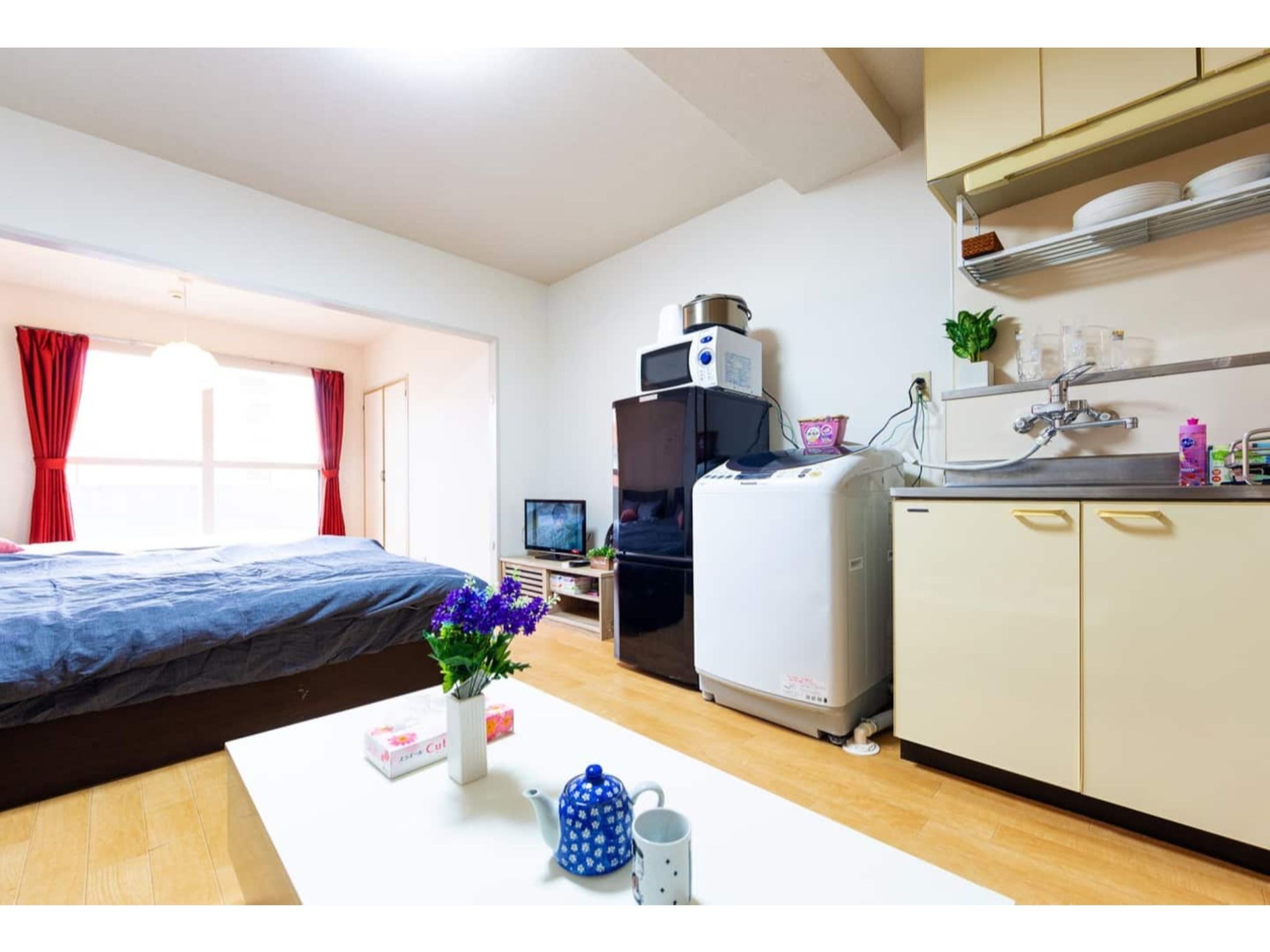 冷蔵庫、電子レンジ、ティッシュ、トイレットペーパー、食器類、調理器具、箸、スプーン、フォーク、ケトル、洗濯洗剤など