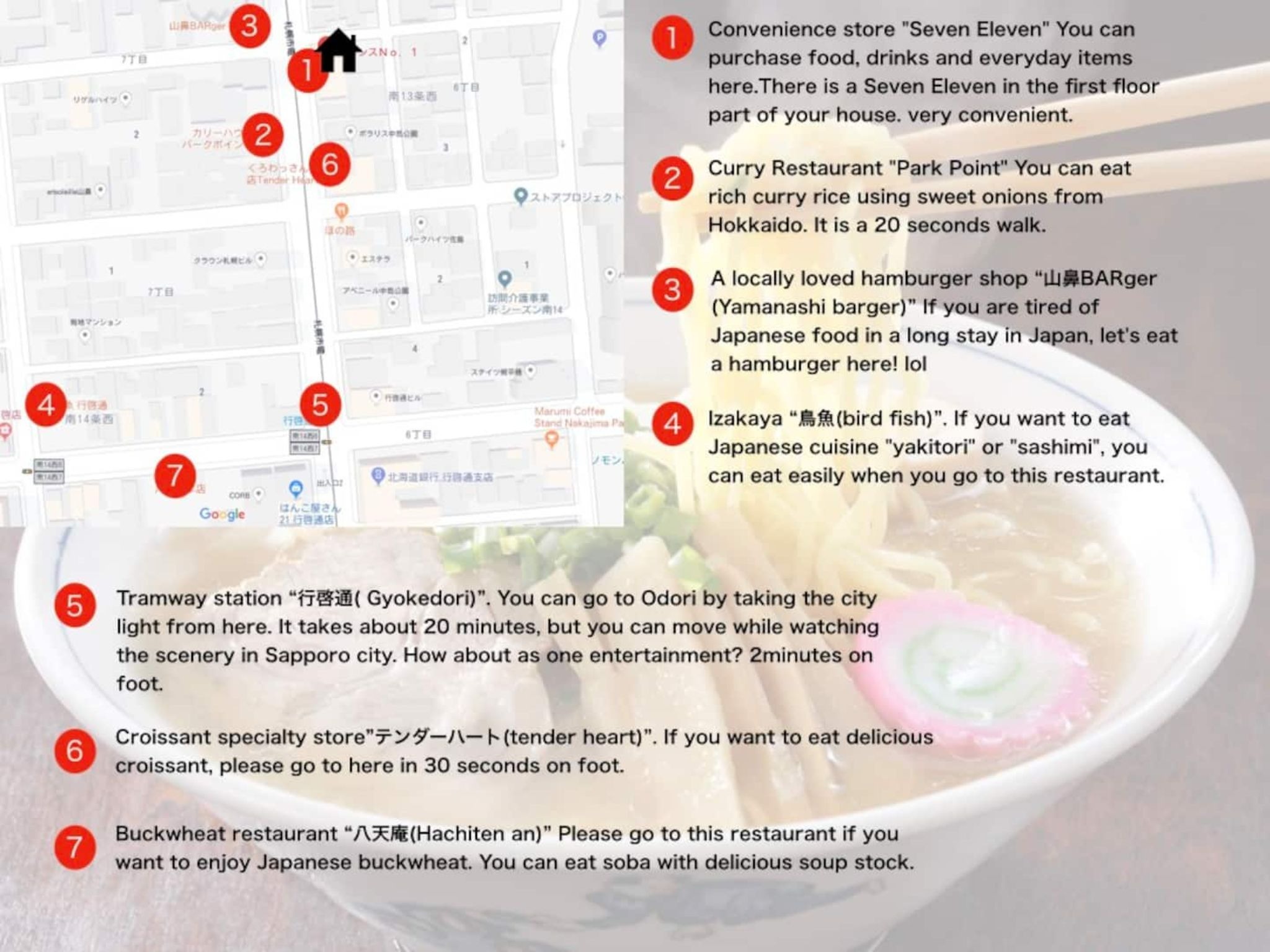 近くには、地元で有名なハンバーガー屋、カレー屋、ベーカリー、ラーメン屋など