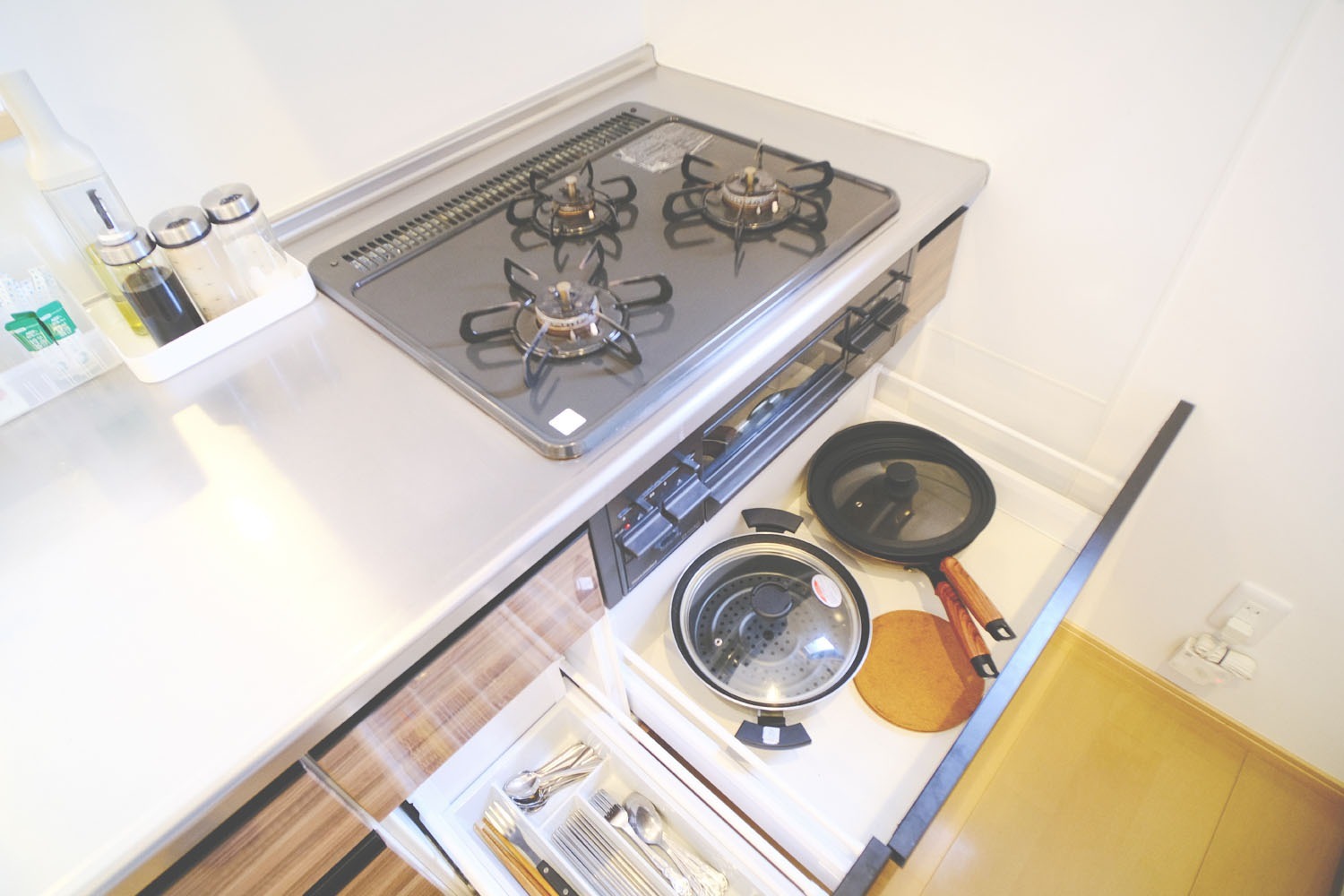 * キッチン-ガスコンロ、鍋、炊飯器、電子ケトル、食器、