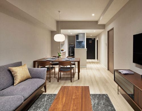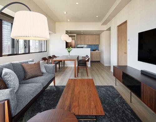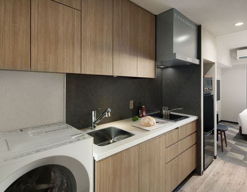 全室にキッチンと洗濯乾燥機を完備。モダンなインテリア、上質なアメニティ、贅沢なサータのベッドで寛ぐサービスアパートメント