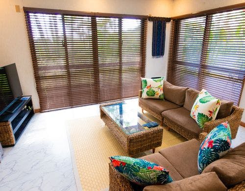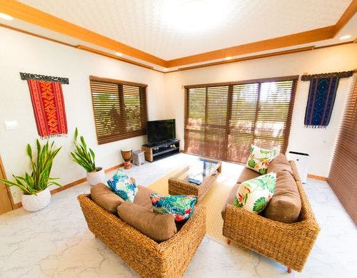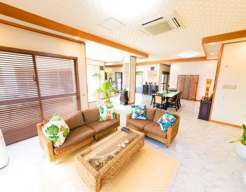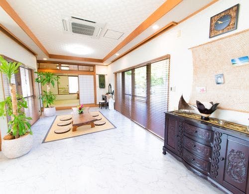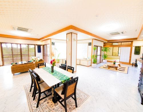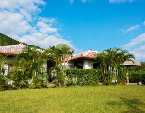 パームヴィラ石垣島yugafuは、琉球赤瓦を携え伝統的な雰囲気を感じることのできる広い芝生が印象的な貸切タイプのリゾートヴィラです