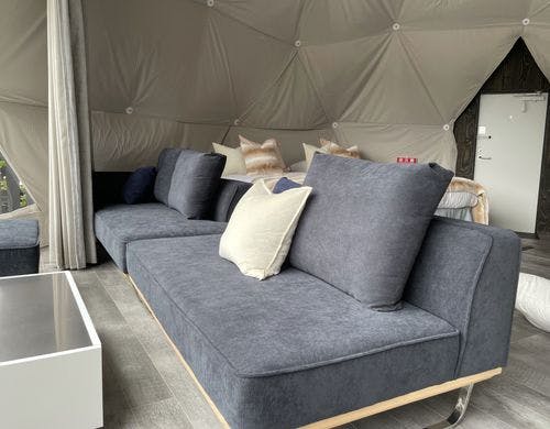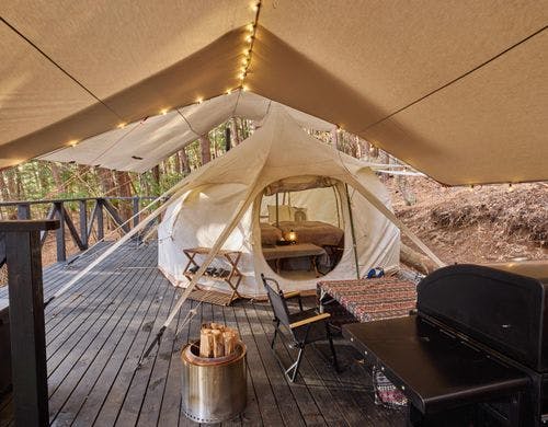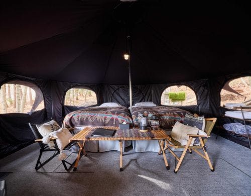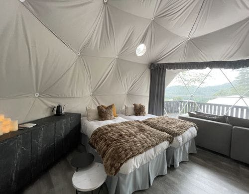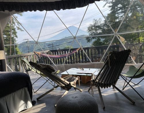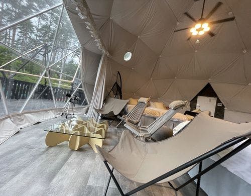 全ドームの中から富士山を望めハイエンドな内装や設備で贅沢な時間を過ごせます。富士山を見ながら焚火やBBQなど非日常体験を