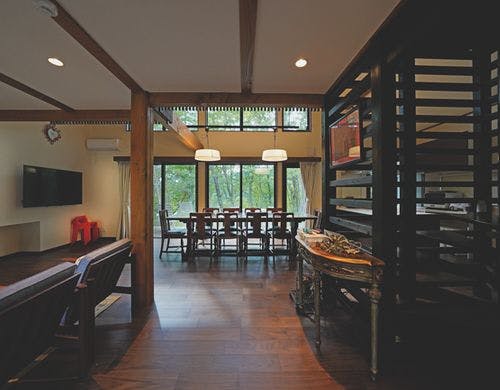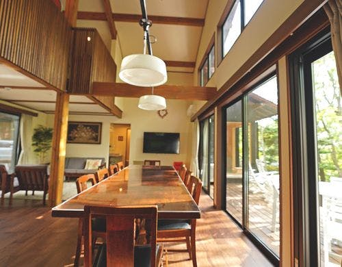 ロイヤルリゾートとして名高い那須高原に位置する温泉付きプライベートヴィラ。最大の特徴は西側の深い渓谷越しの那須連山の眺望です。美人の湯と呼ばれるPH9.9の天然温泉の半露店風呂に浸り、那須連山に沈む夕陽をお楽しみください。