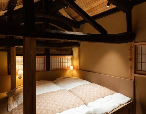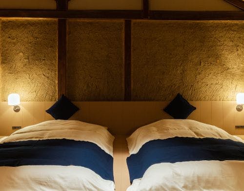 2021年秋オープン。古民家を改修した九州のクラフトを体感する宿。藍・竹をテーマにしたお部屋。杉の桶に入った朝食。