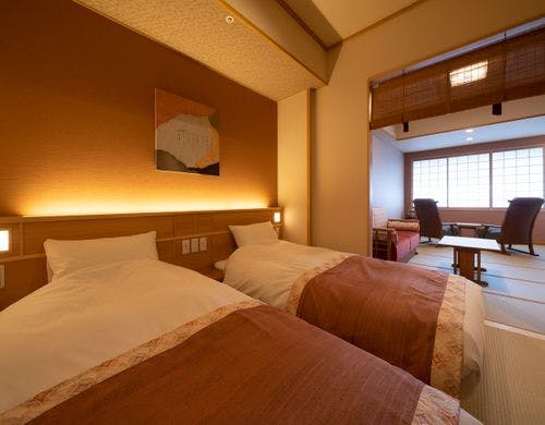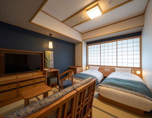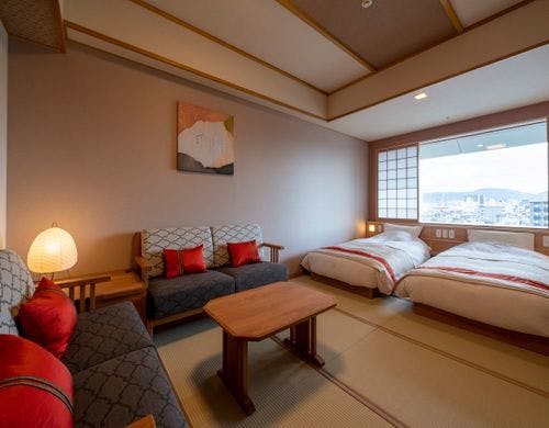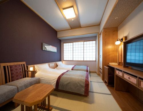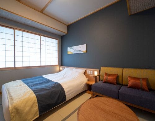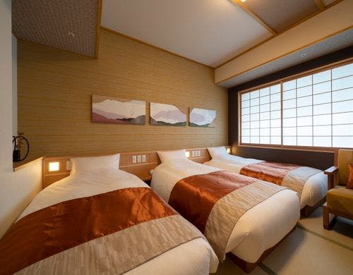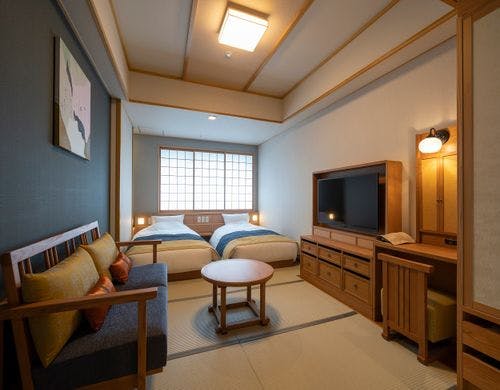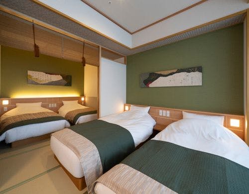 和歌の世界観を取り入れた客室は、旅のスタイルに応じて4種類から選べます。ダブルルームは一人旅やカップル向け、ツインルームはご夫婦や友人同士に最適です。トリプルルームはグループや女子旅向け、フォースルームは家族や大人数での宿泊に適しています。全室に機能性を考慮した設備が整えられ、快適に過ごせる空間が広がります。