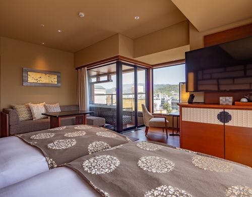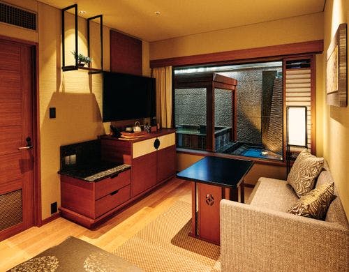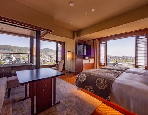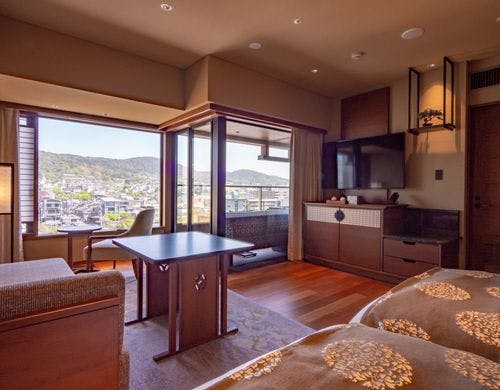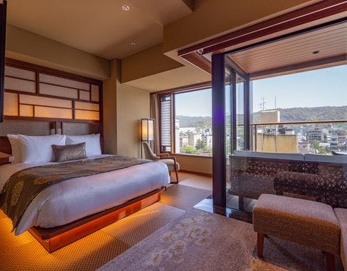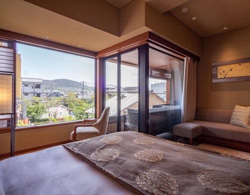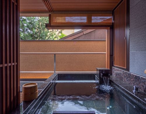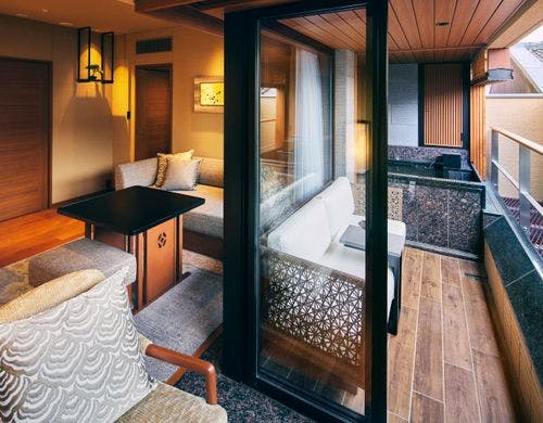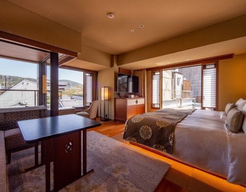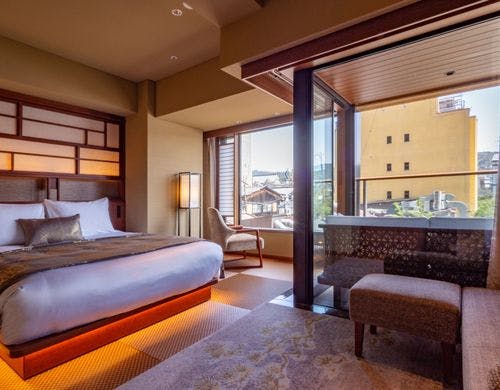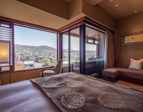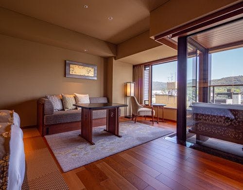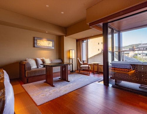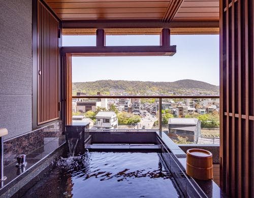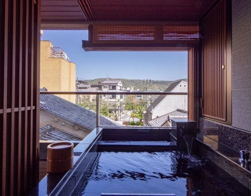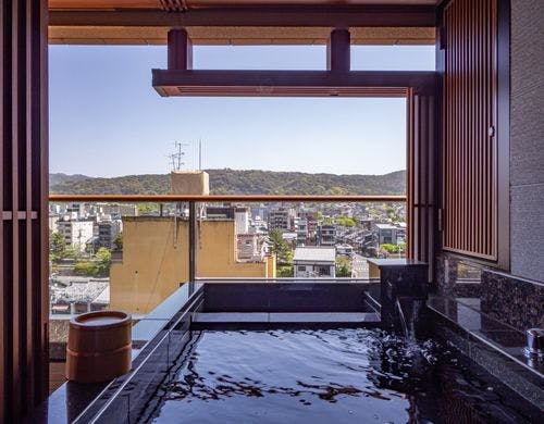 京都河原町駅から徒歩1分。全室露天風呂付き客室、古都一望の大浴場、東山を望む空庭テラス、本格京料理も