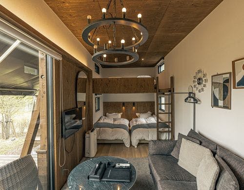 富士山が望める庭付きプライベートキャビン。満点の星空のもと、焚火とBBQを楽しみながらプライベート空間で極上の宿泊体験を