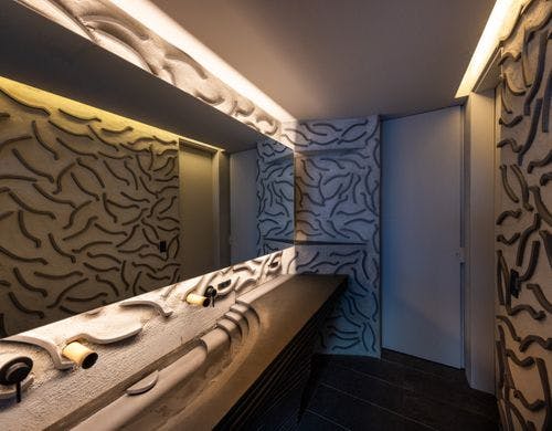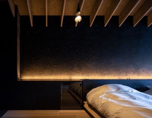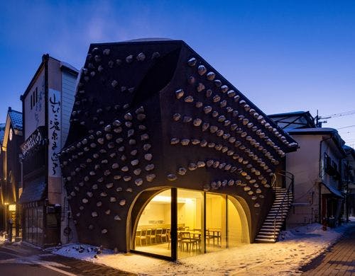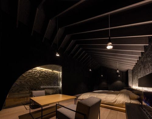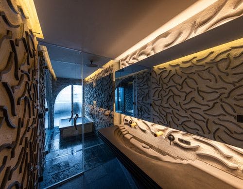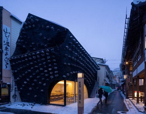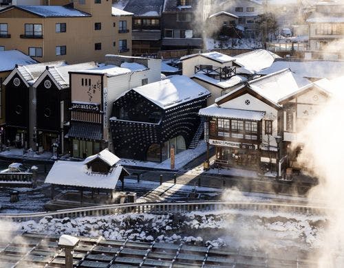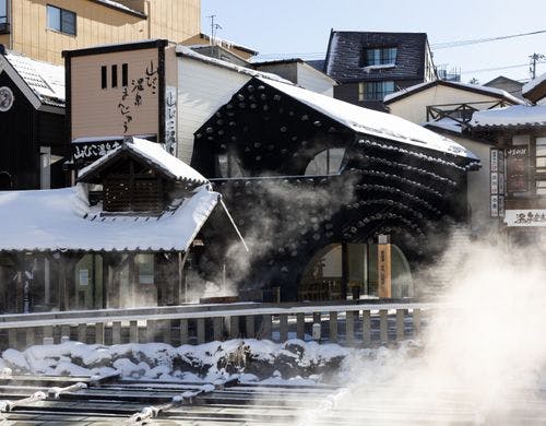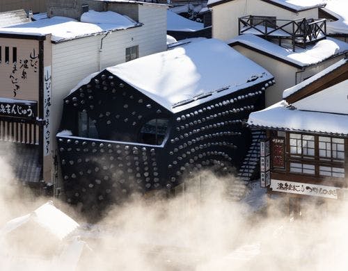 建築家 隈研吾の設計デザインで、コンセプトは「湯畑の立体化」。ゴロゴロと積まれた浅間石、その中を流れる温泉。湯畑を眺めながら、「湯畑」に包まれた空間を体感できます。