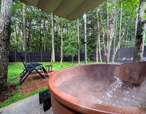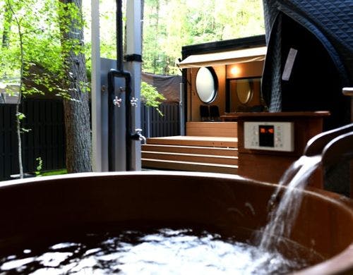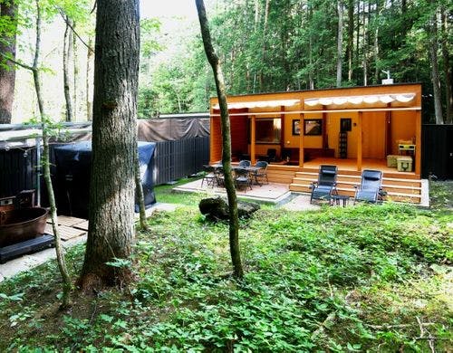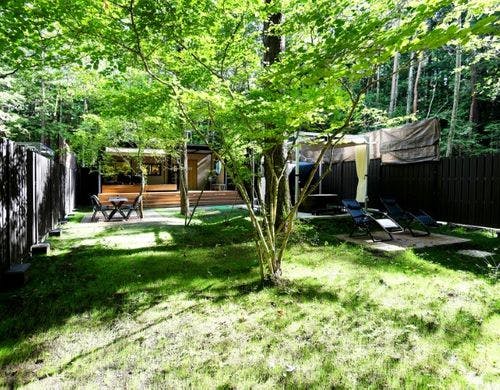 1棟貸切のトレーラーキャビン。天然温泉露天風呂やサウナとプライベートガーデン完備。BBQ、焚火もお楽しみいただけます。