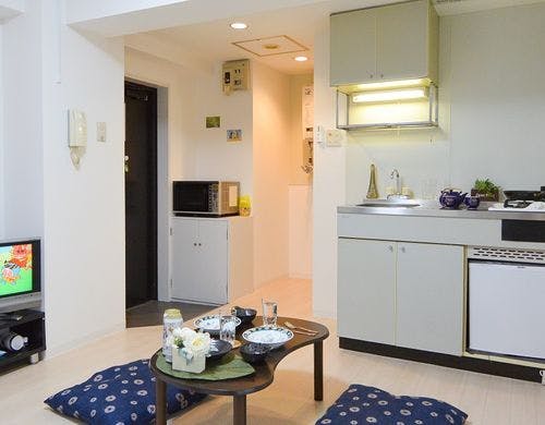 お部屋にはキッチン・風呂・トイレ・テレビ・ミニ冷蔵庫・電子レンジ・ストーブが設備でございます。