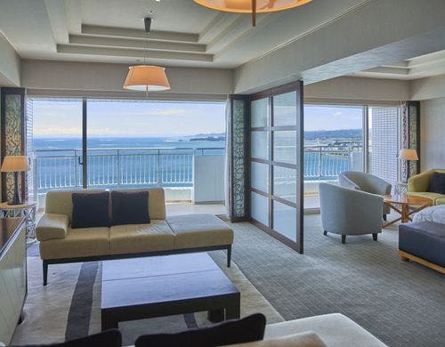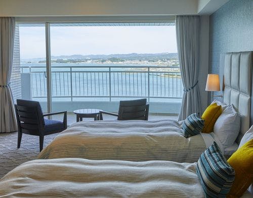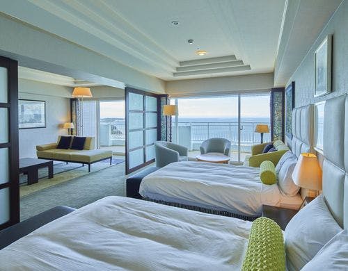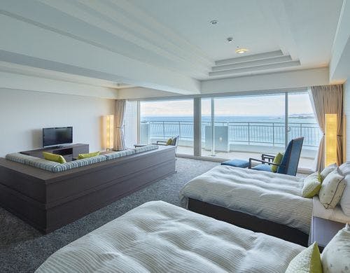 【全室35平米以上のオーシャンビュー客室で絶景を満喫】太平洋一望の大浴場では、良質な天然温泉に浸かって癒しのひと時を。