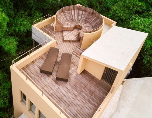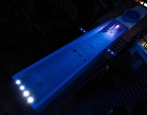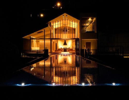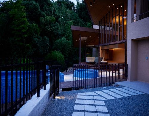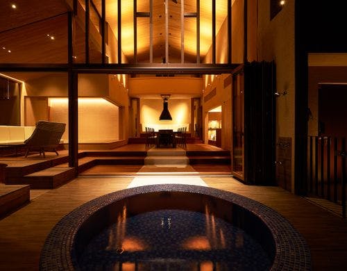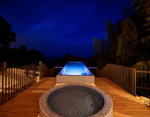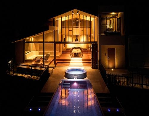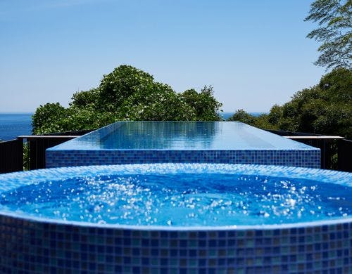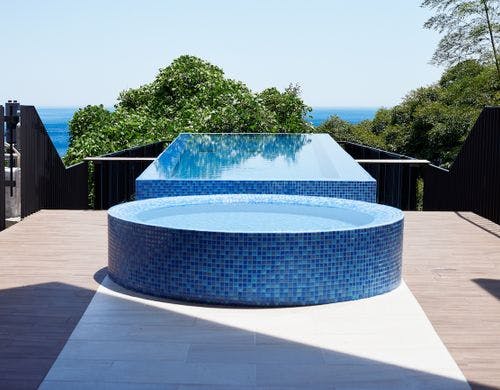 海に向かって伸びるプールとジャグジー、遠く水平線を望む半露天風呂に、巨大スクリーンを配したガラス張りの吹き抜けリビング。最高の時を共有できるオーシャンフロントレジデンで開放感溢れる特別なひとときを