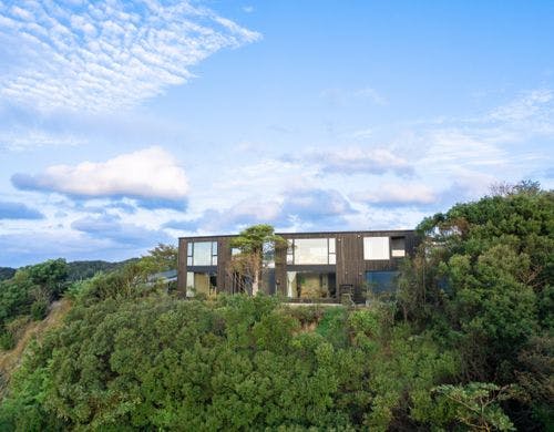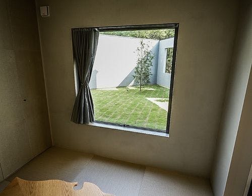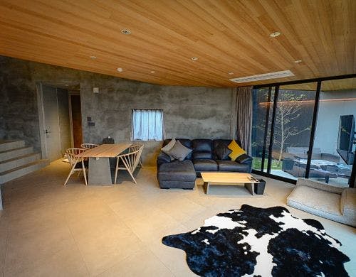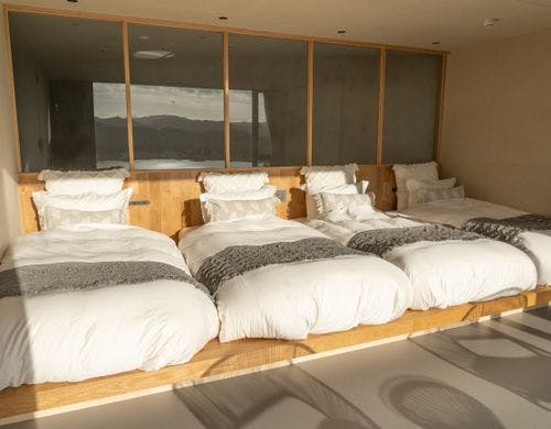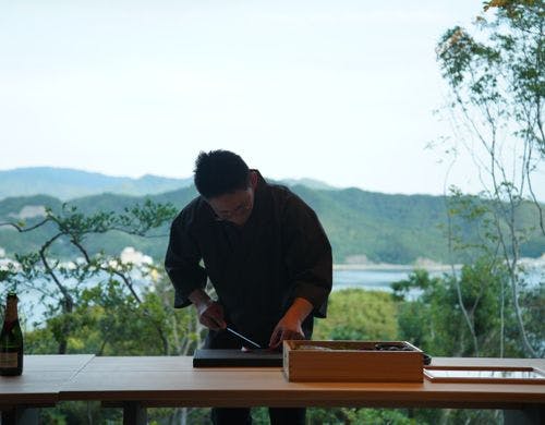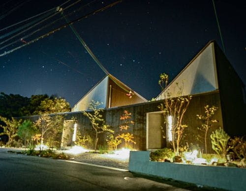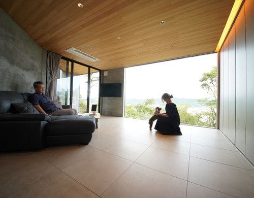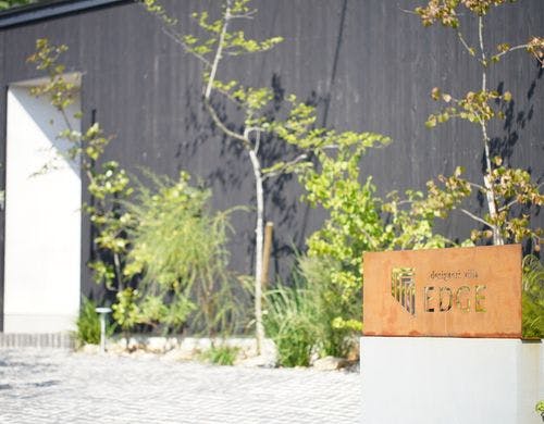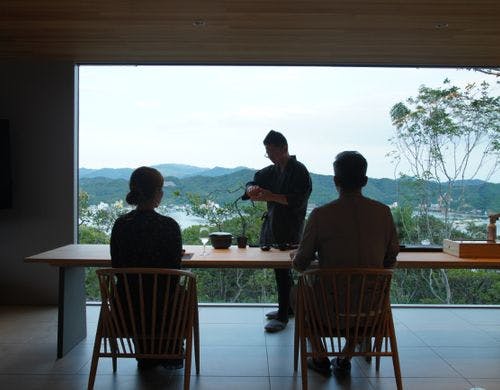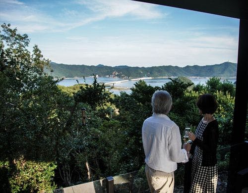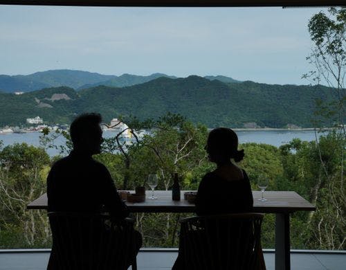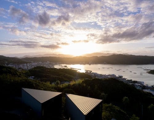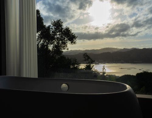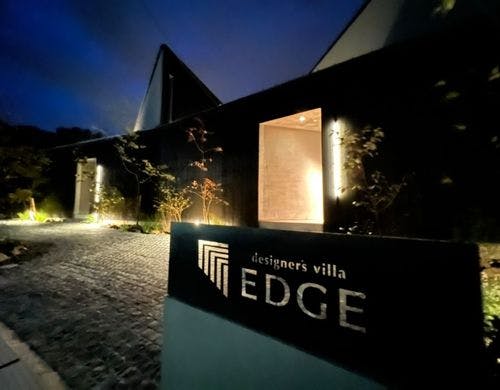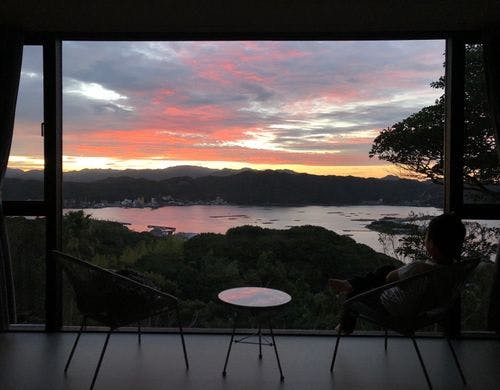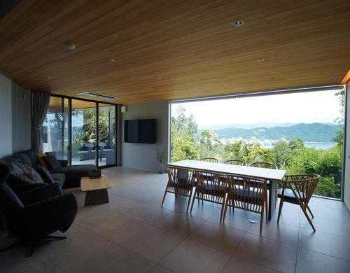 淡路島の南端、高台の端に建つ三角形の建物、designer's villa EDGE リビングや寝室から一望できる福良湾の絶景と和紙やタイルが織りなすラグジュアリーな室内空間でお客をおもてなしします。