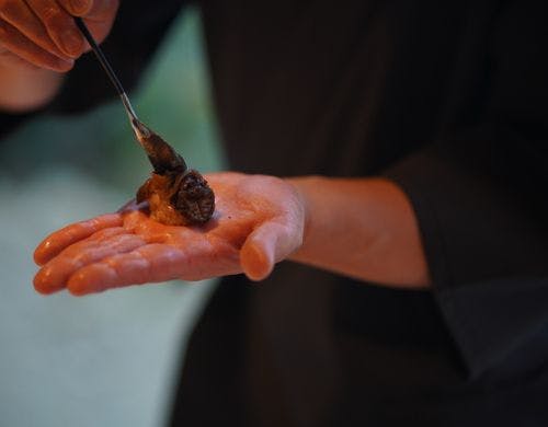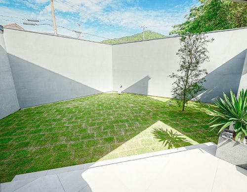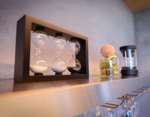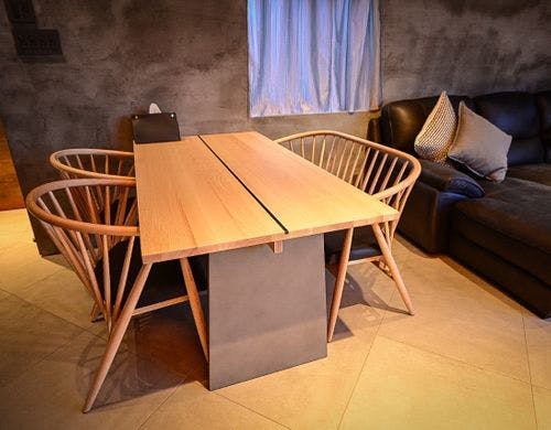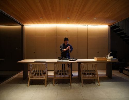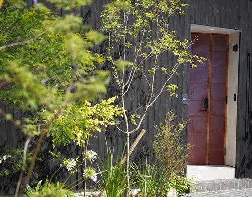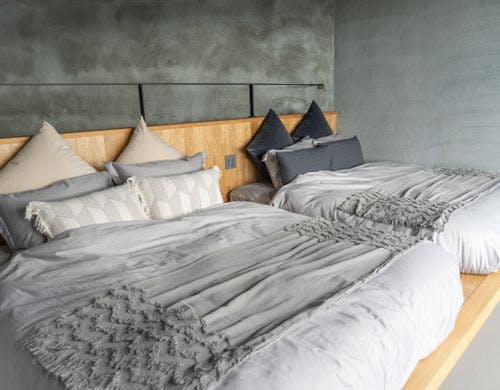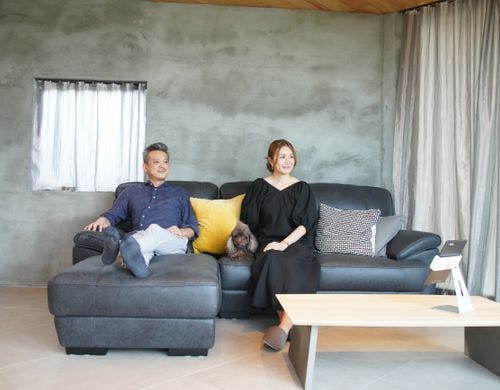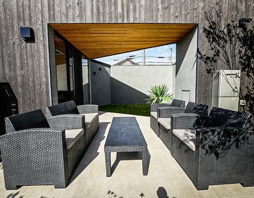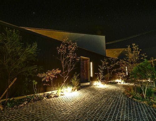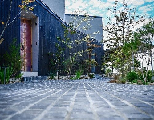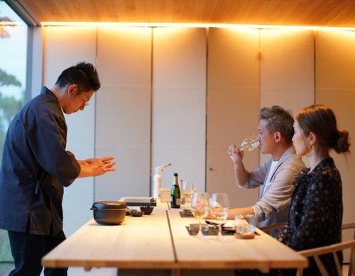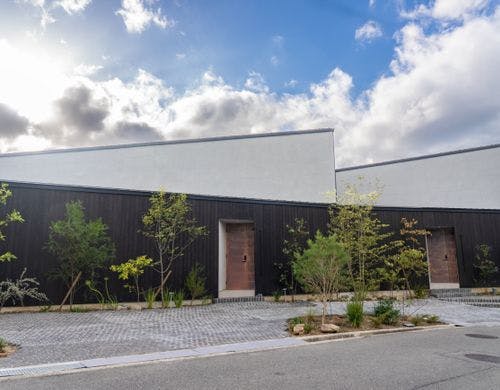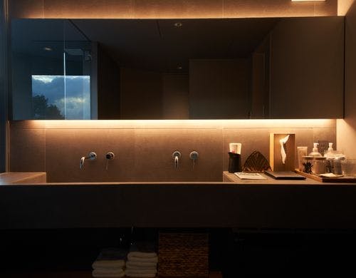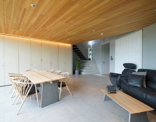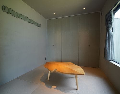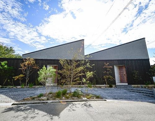 淡路島の南端、高台の端に建つ三角形の建物、designer's villa EDGE リビングや寝室から一望できる福良湾の絶景と和紙やタイルが織りなすラグジュアリーな室内空間でお客をおもてなしします。