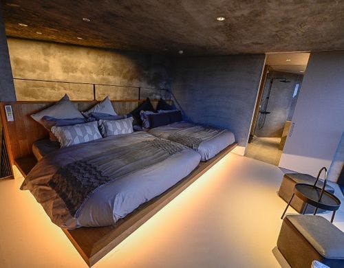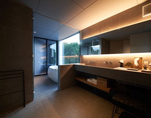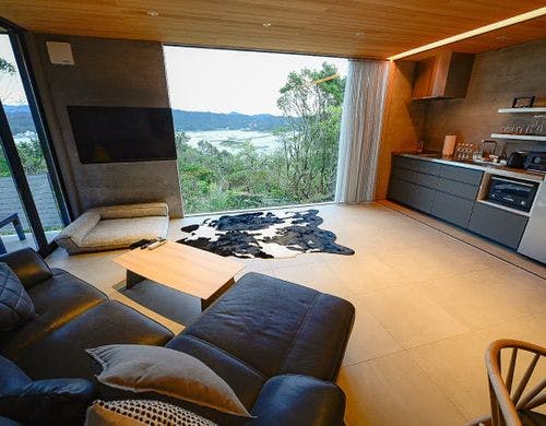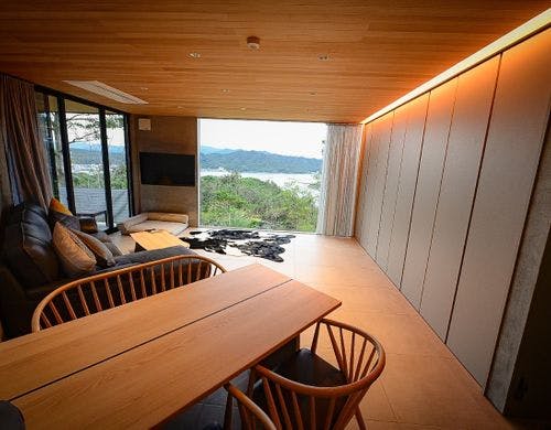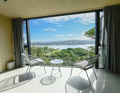 44,560円~ )淡路島の南端、高台の端に建つ三角形の建物、designer's villa EDGE リビングや寝室から一望できる福良湾の絶景と和紙やタイルが織りなすラグジュアリーな室内…
