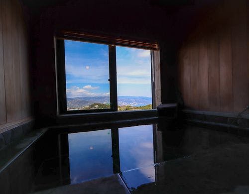 富士山や海を遠くに望めるログハウスでは、温泉もお楽しみいただけます。時間を忘れて、極上のひと時を。
