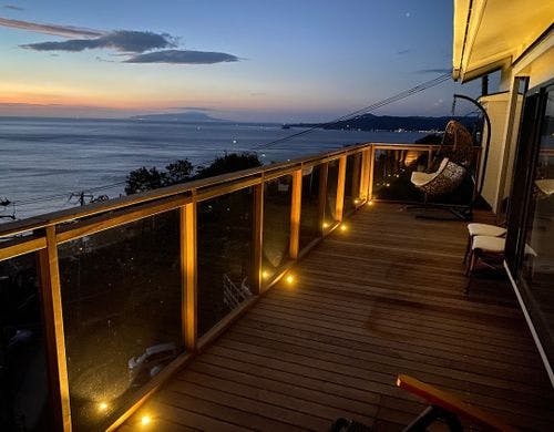 1棟貸し切りで気兼ねなく過ごせるプライベートハウスです。かけ流しの天然温泉とオーシャンフロントの絶景、日の出をおたのしみください。
