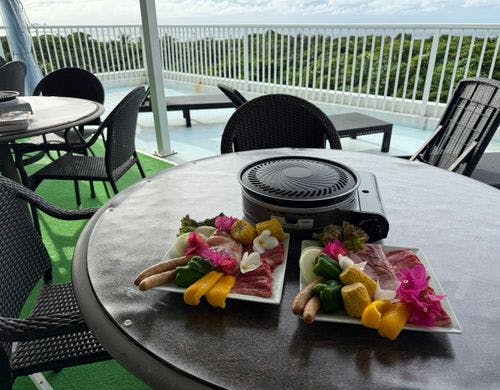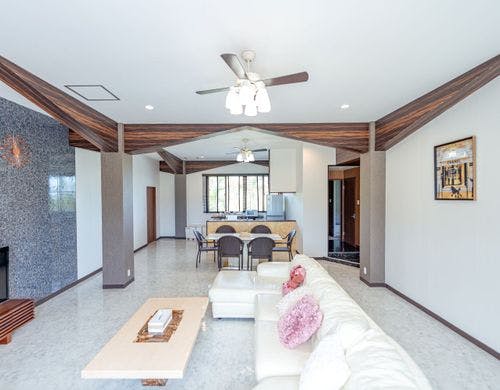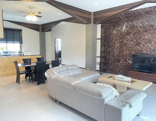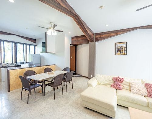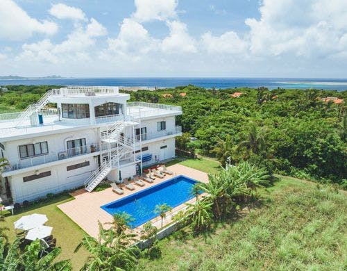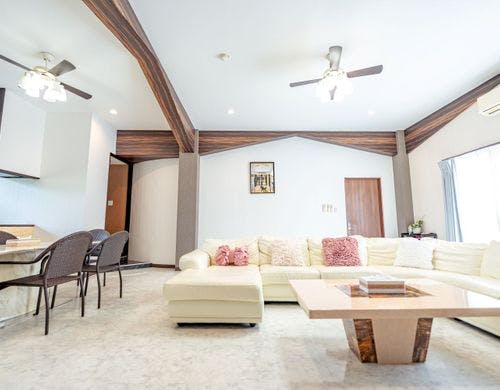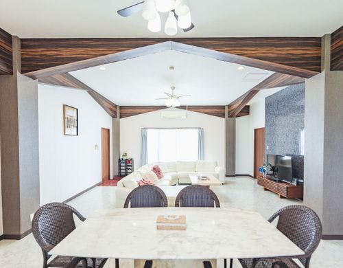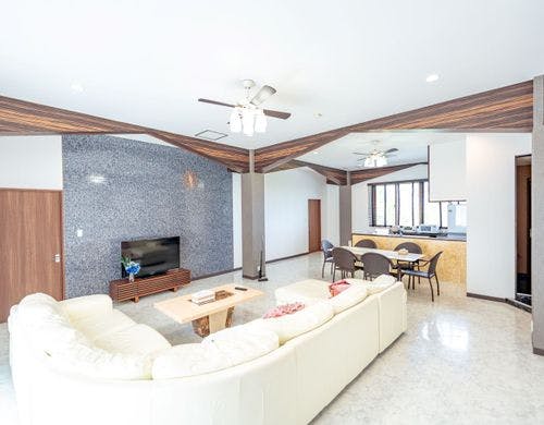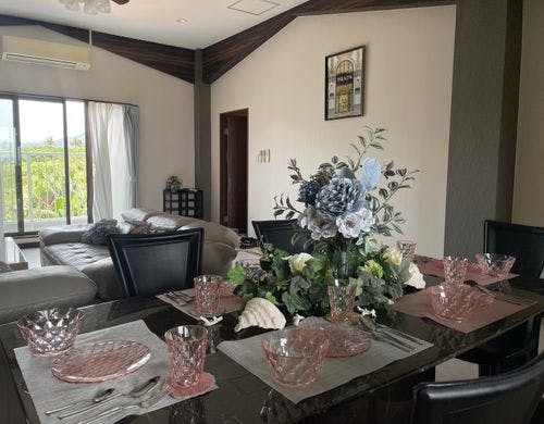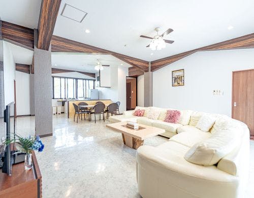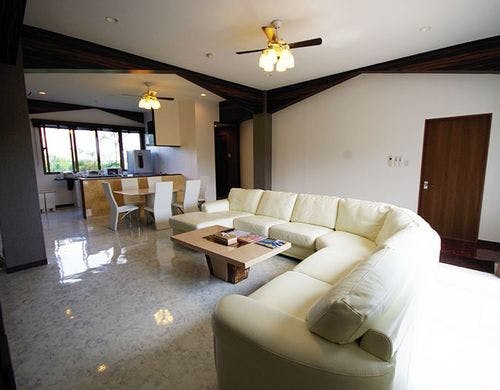 全室110平米のスィートルームは、最大8名様が座れるソファーと6名がけのダイニングテーブルとお食事などもゆっくりと寛げる空間となっております、屋上テラスからは米原ビーチ・青の洞窟・川平湾が見渡せます。
