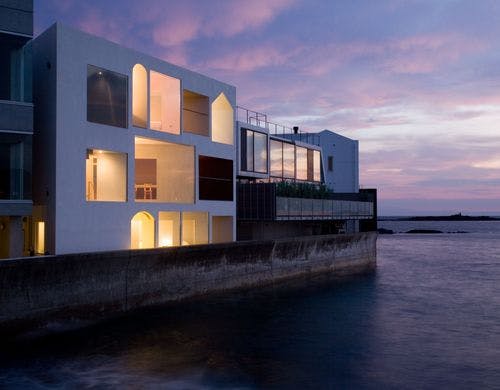 上から見ると三角形をしたユニークな建物。全室オーシャンビューで、どの部屋にいても海との一体感が味わえる一軒家です。