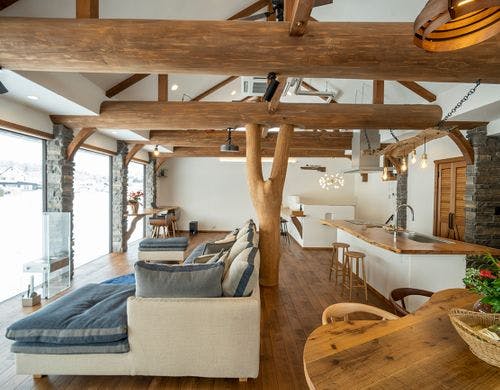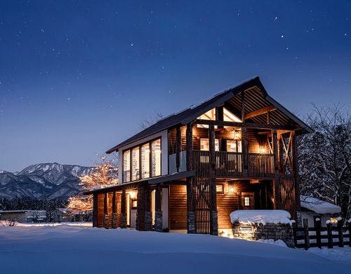 村内でも抜群の立地にあり、北アルプスを一望できます。 大切な人と大切な時間をお過ごしになれるよう、木のぬくもりにあふれるこだわりの建築でお待ちしています。