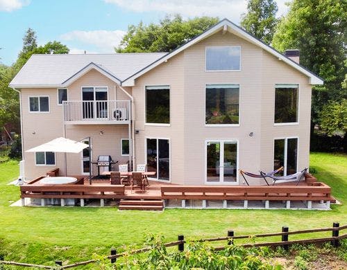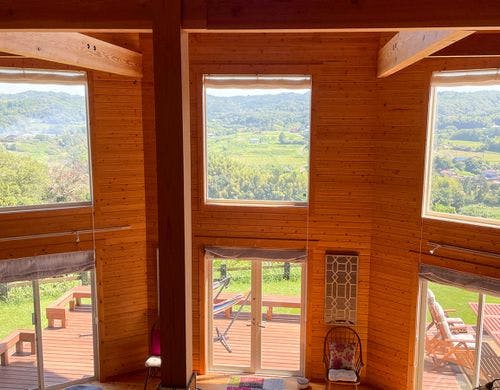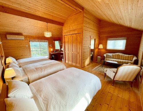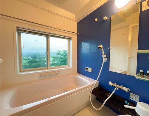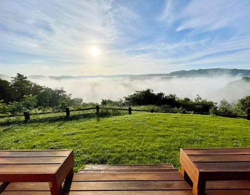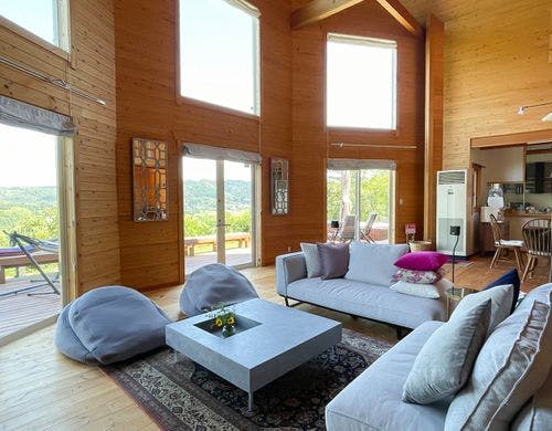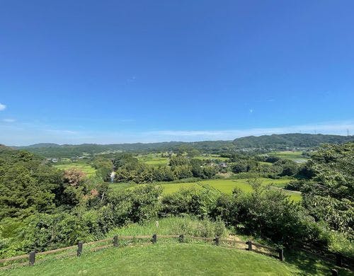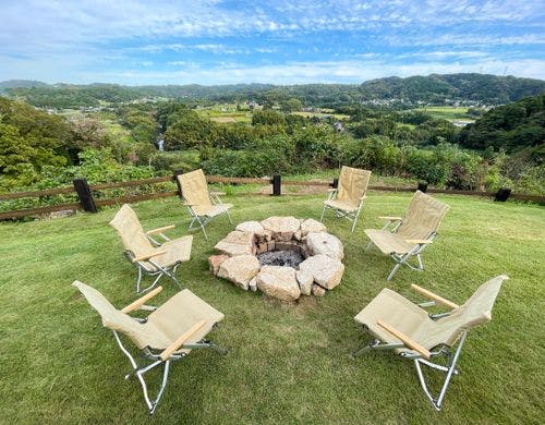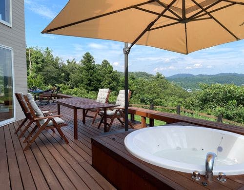 房総半島、見晴らしのよい上総丘陵に佇む一棟貸切別荘。広い敷地内の庭やテラスからは周囲の山並みや久留里の田園風景、夜空を埋め尽くす満天の星々をご覧いただけます。デッキのジャグジーでのんびりリラックス